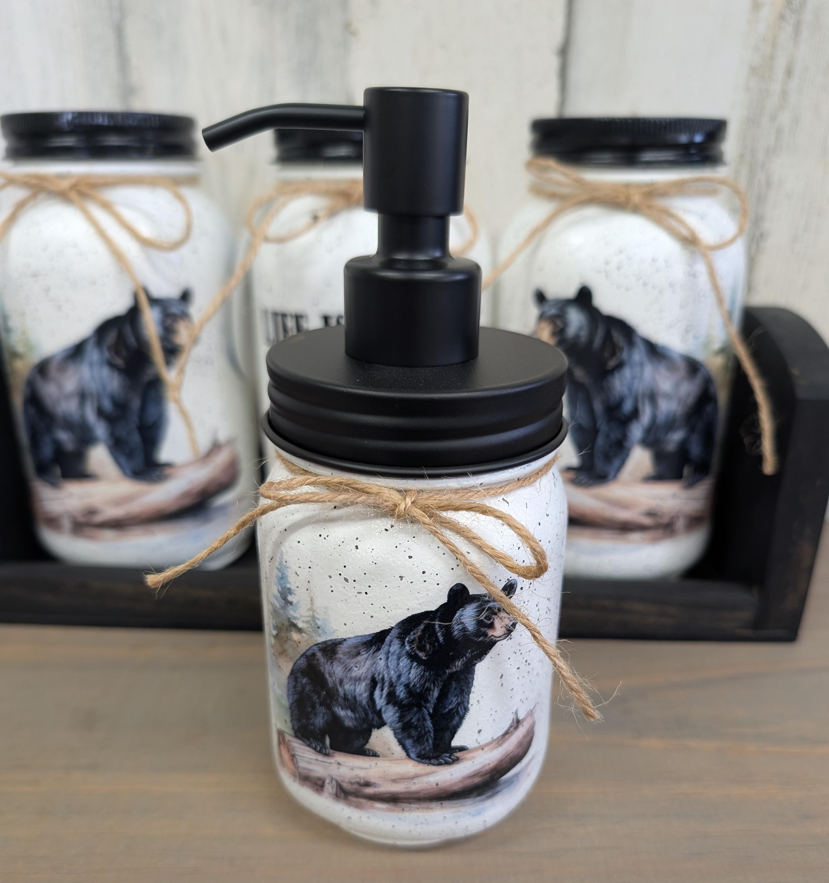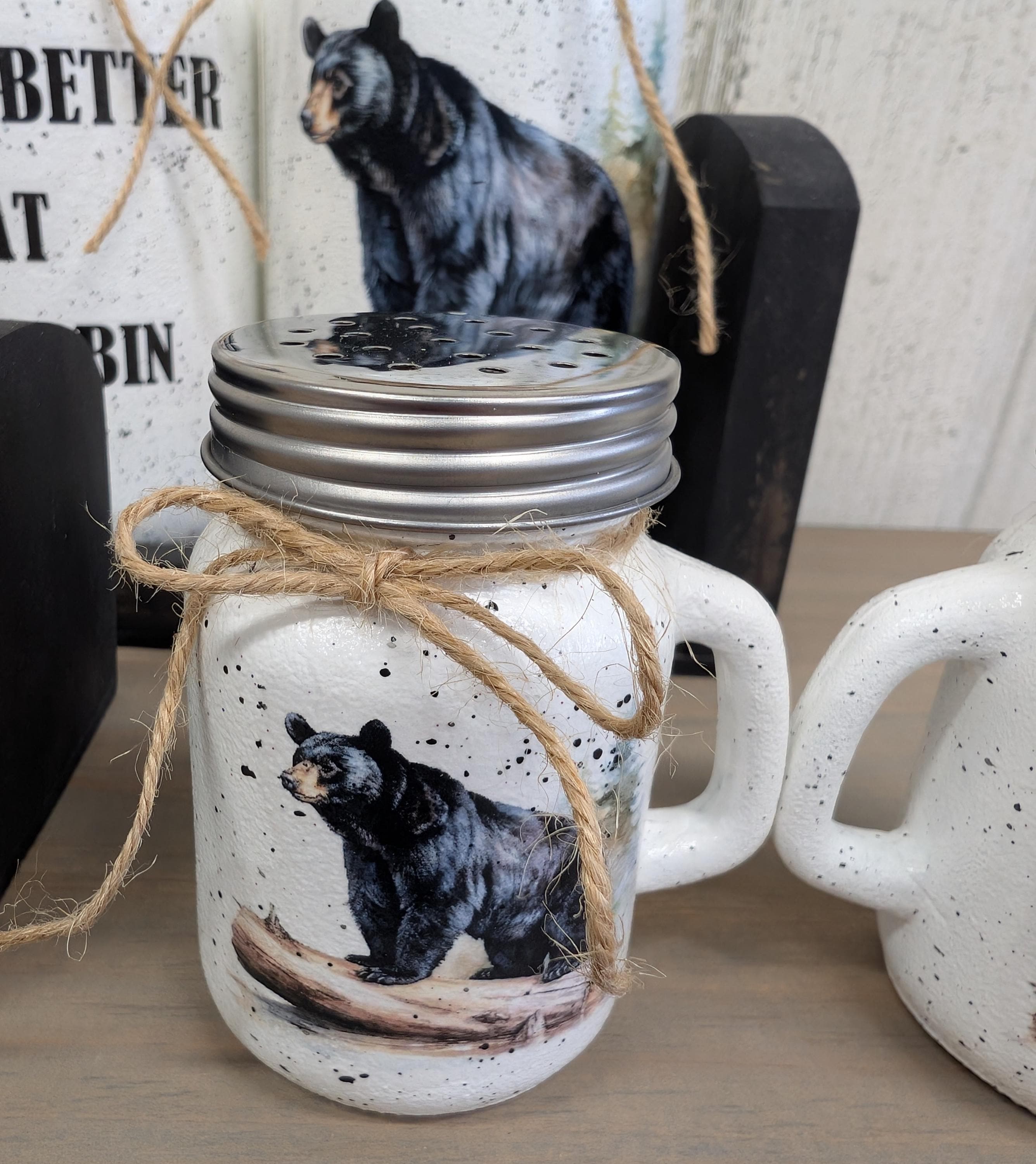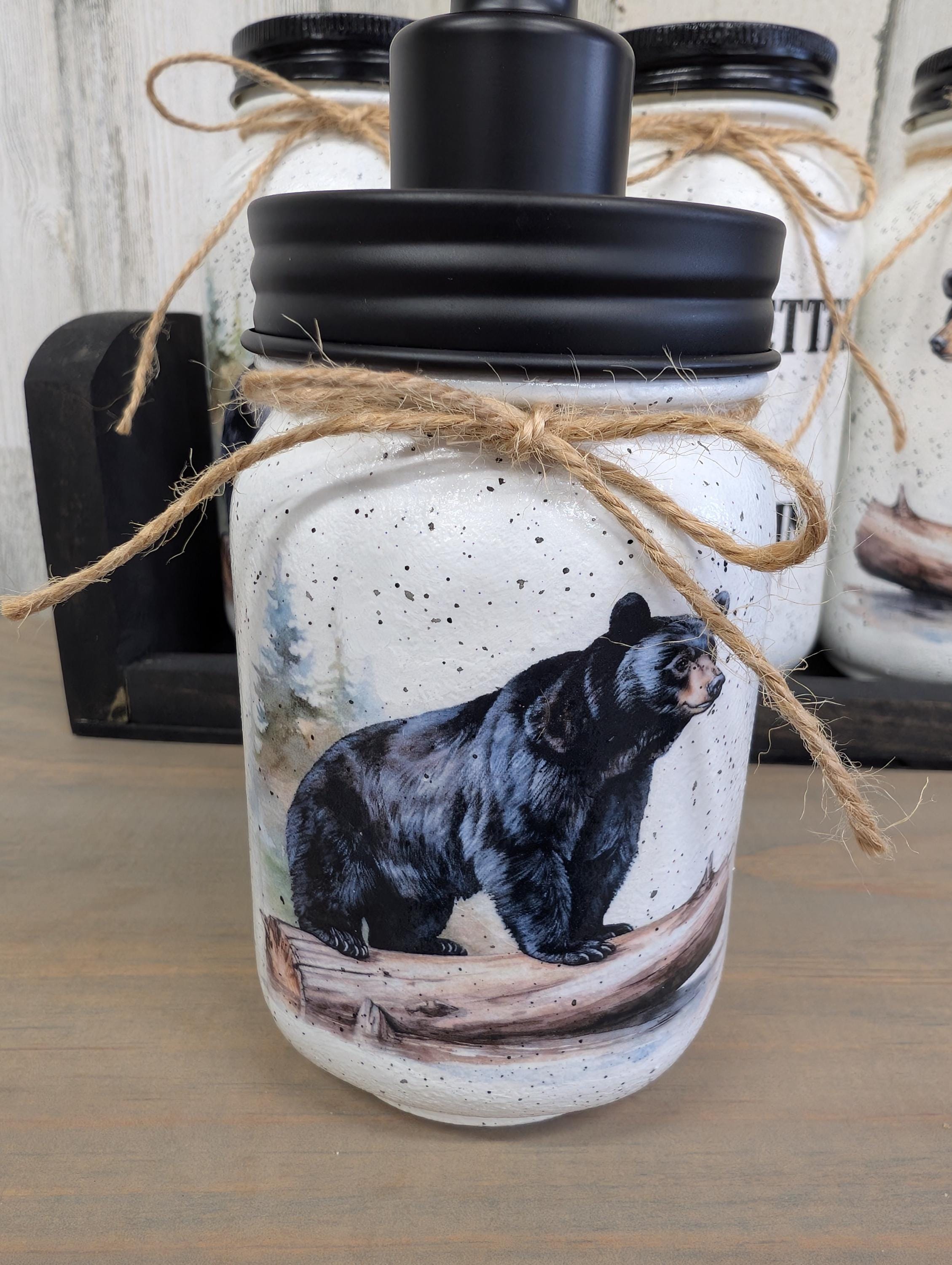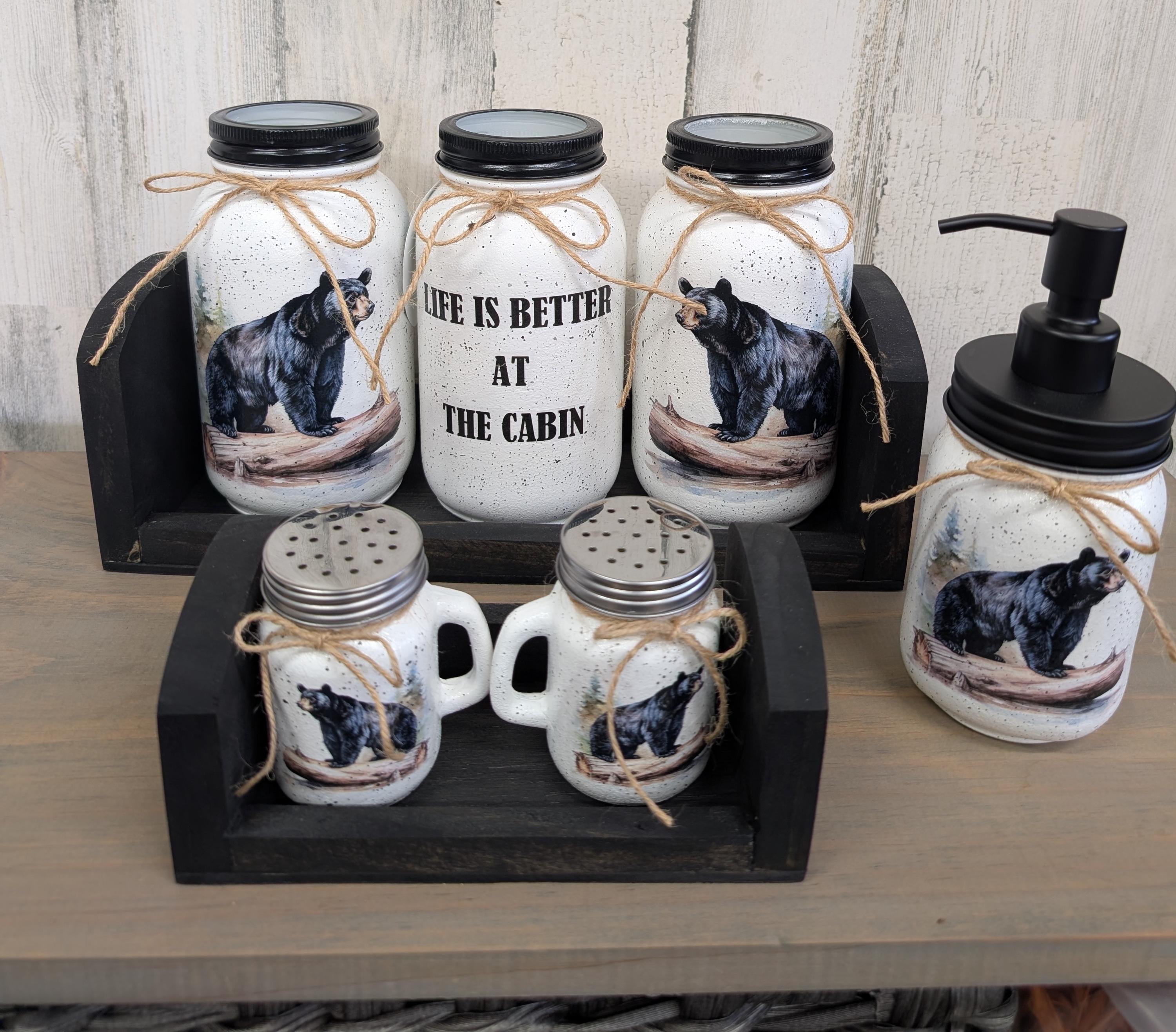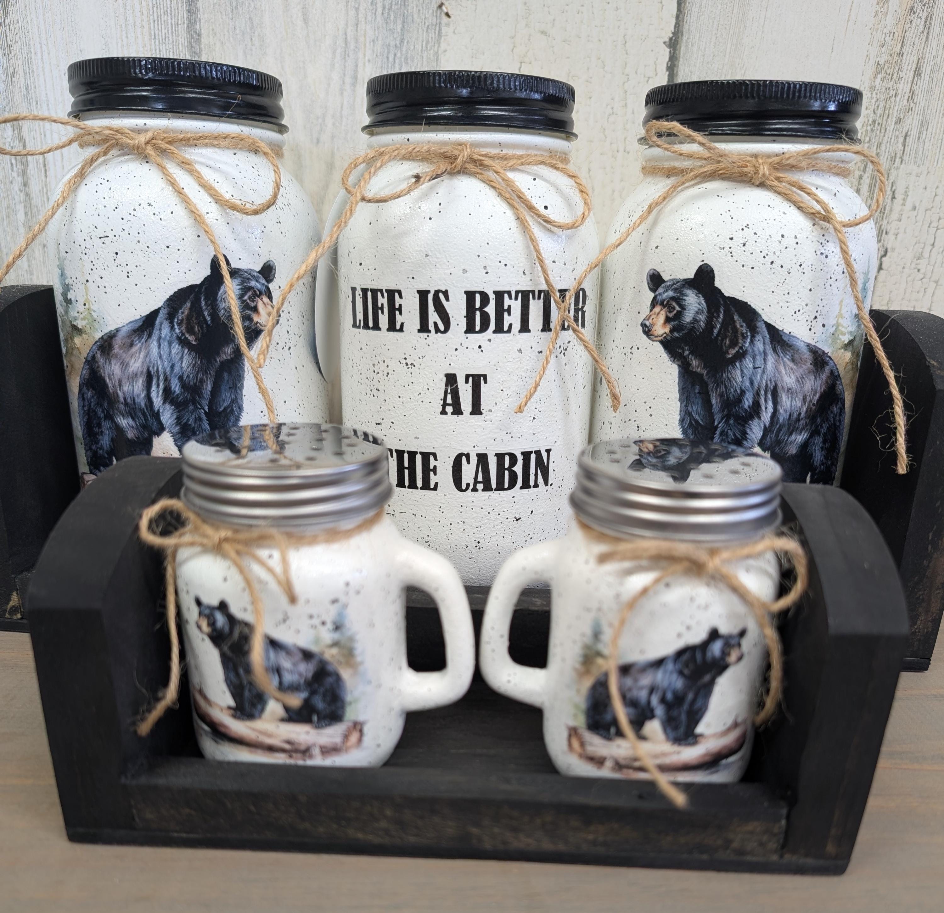 Five-piece Black bear kitchen set includes 3 utensil holders with the wooden box, salt and pepper shakers with the wooden box, and a soap dispenser. All the jars are hand painted with white chalk paint and the bears are applied using the decoupage technique. All of the jars are then varnished with several coats of a gloss varnish. The wooden boxes are handmade using pine wood and then stained ebony. This beautiful Cabin decor Black bear kitchen set would look great in any kitchen, or make a wonder gift.