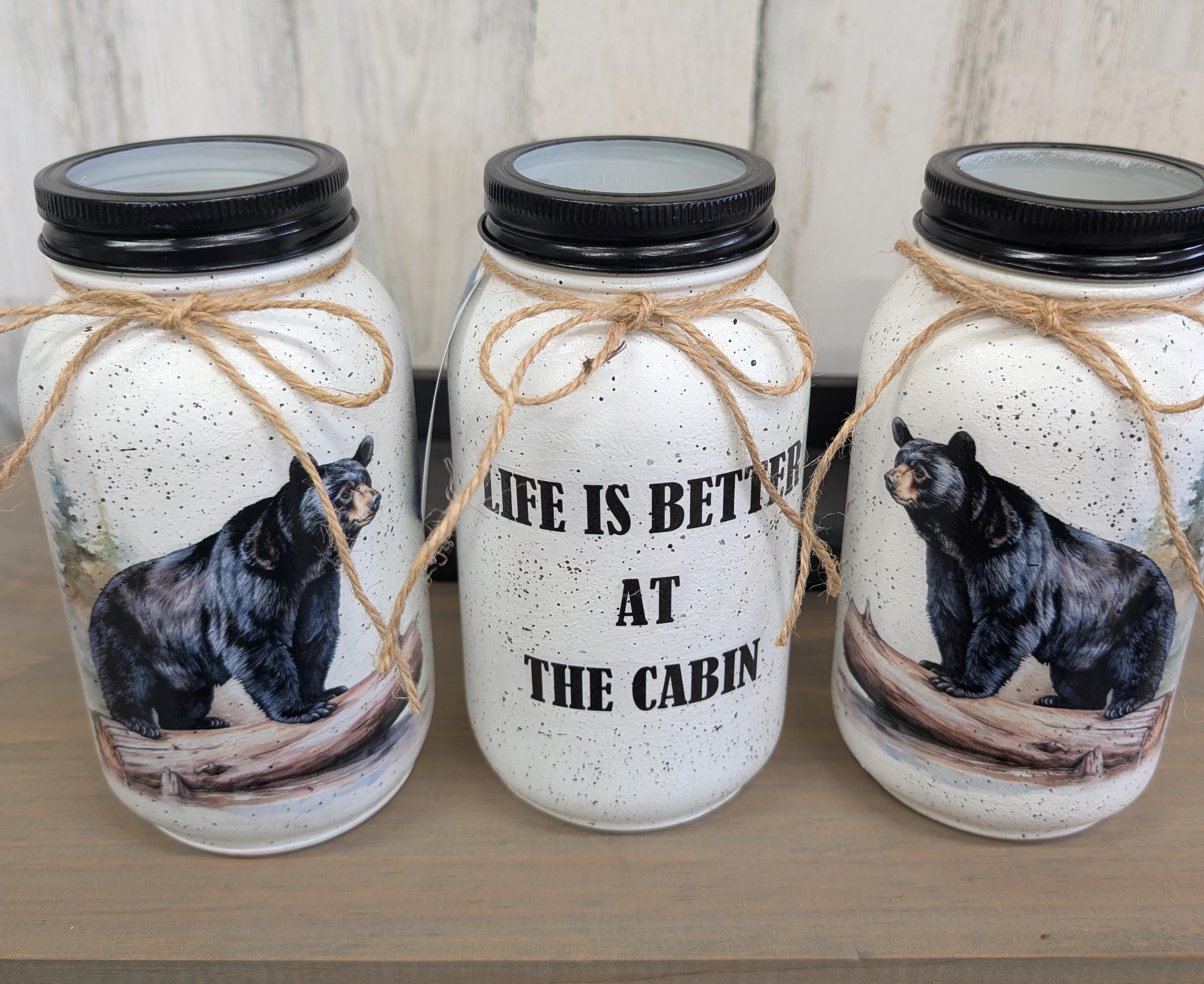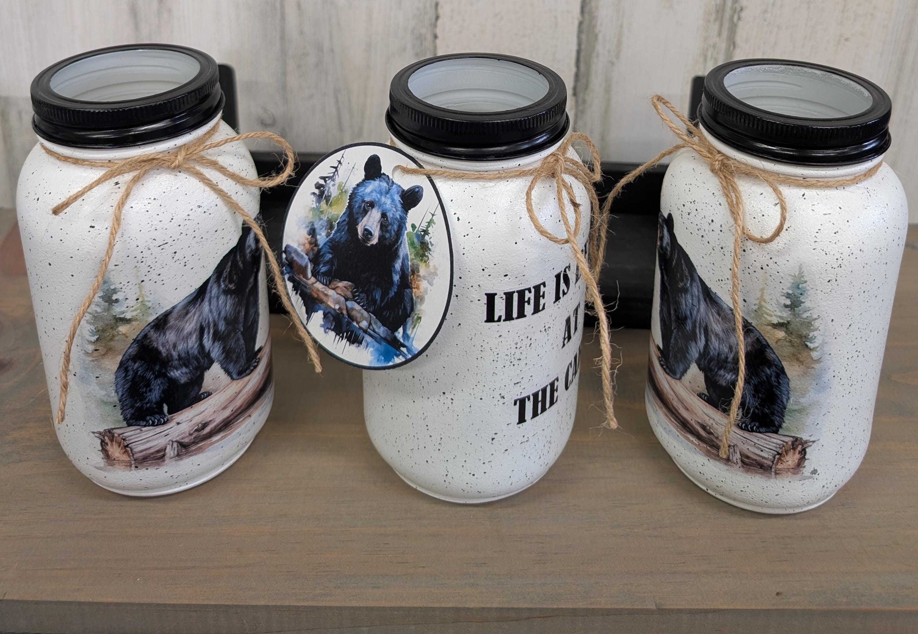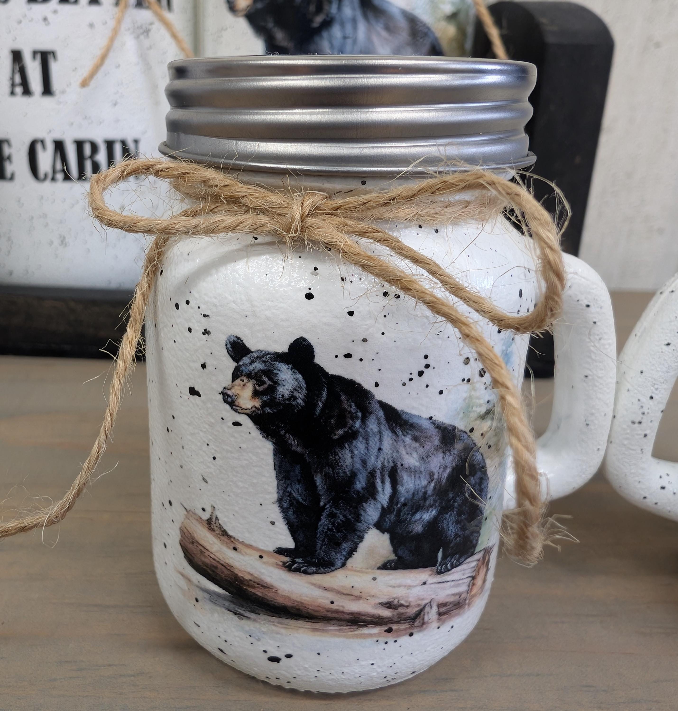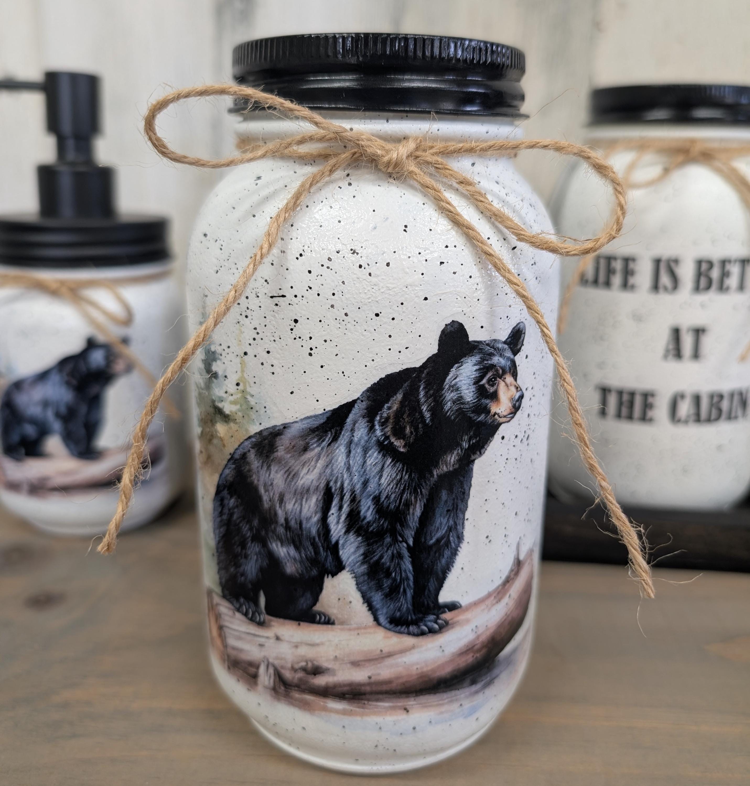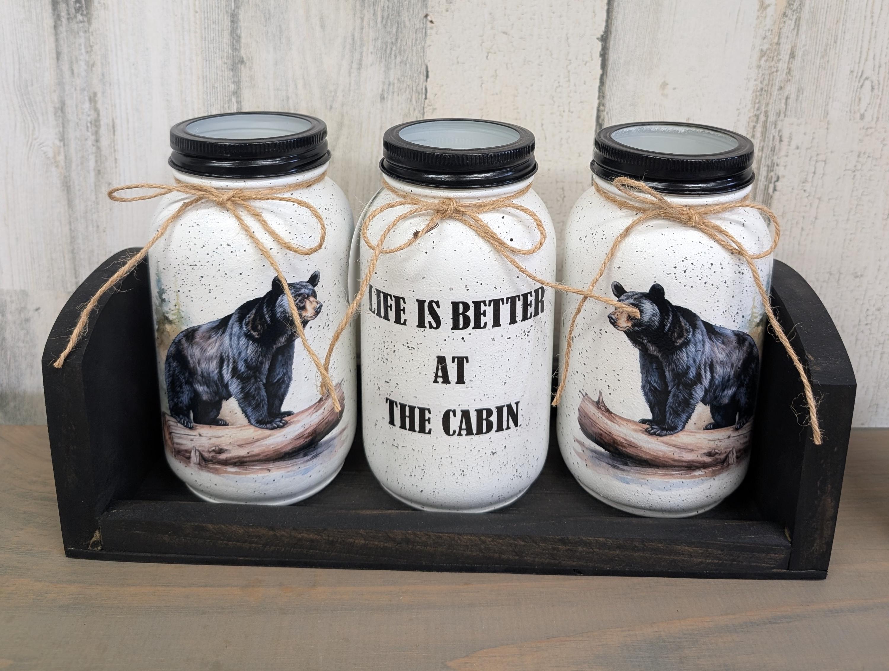 Five-piece Black bear kitchen set includes 3 utensil holders with the wooden box, salt and pepper shakers with the wooden box, and a soap dispenser. All the jars are hand painted with white chalk paint and the bears are applied using the decoupage technique. All of the jars are then varnished with several coats of a gloss varnish. The wooden boxes are handmade using pine wood and then stained ebony. This beautiful Cabin decor Black bear kitchen set would look great in any kitchen, or make a wonder gift.