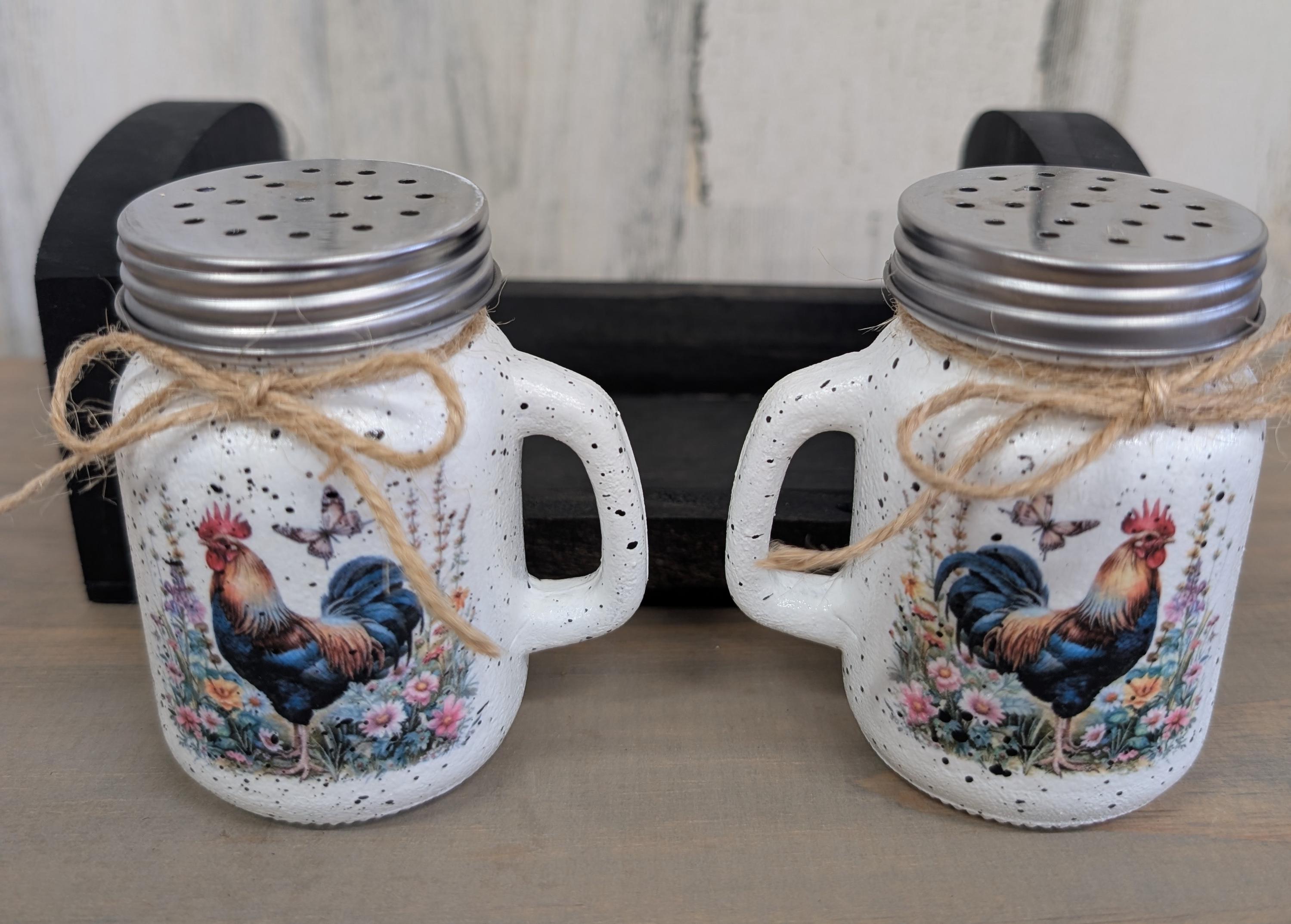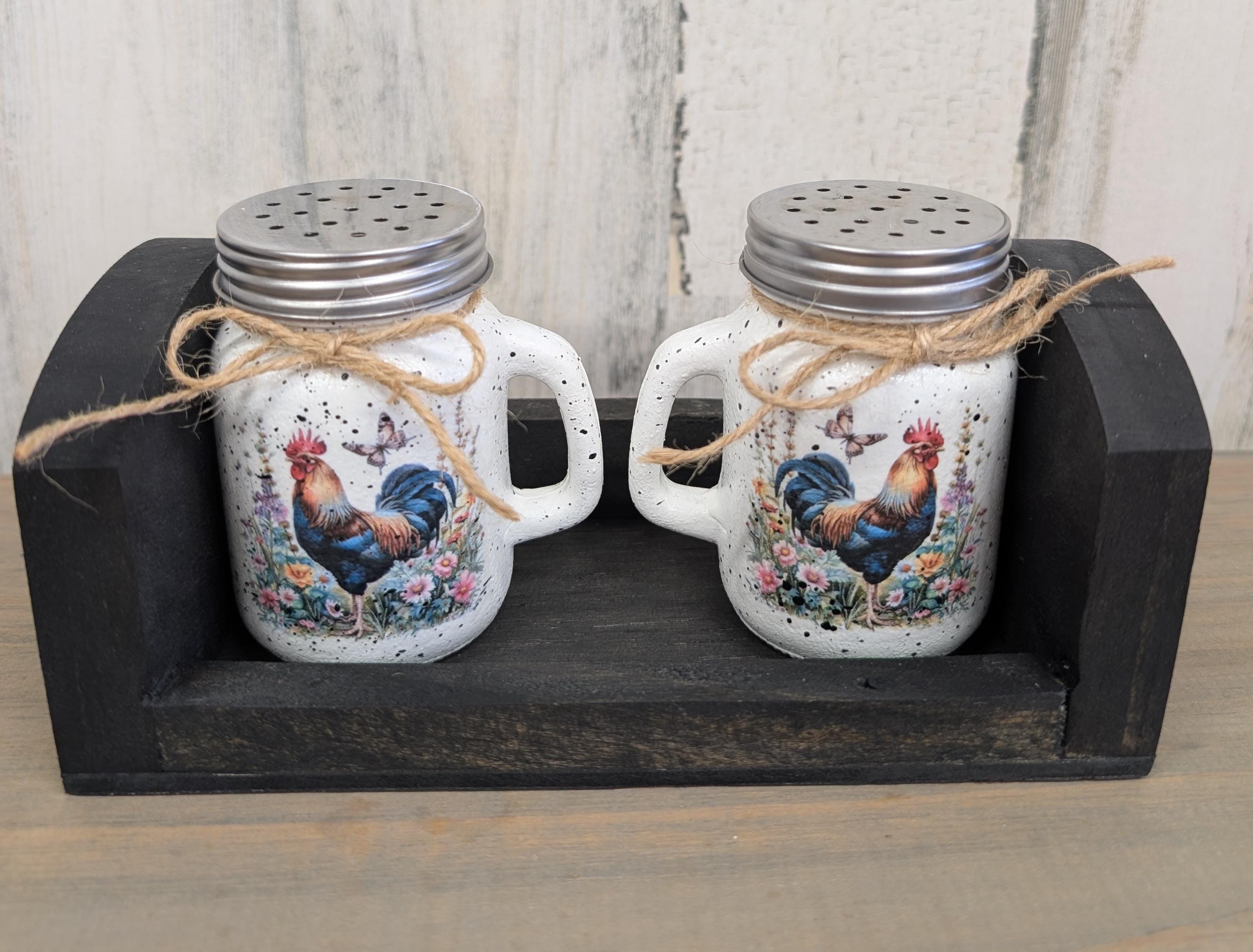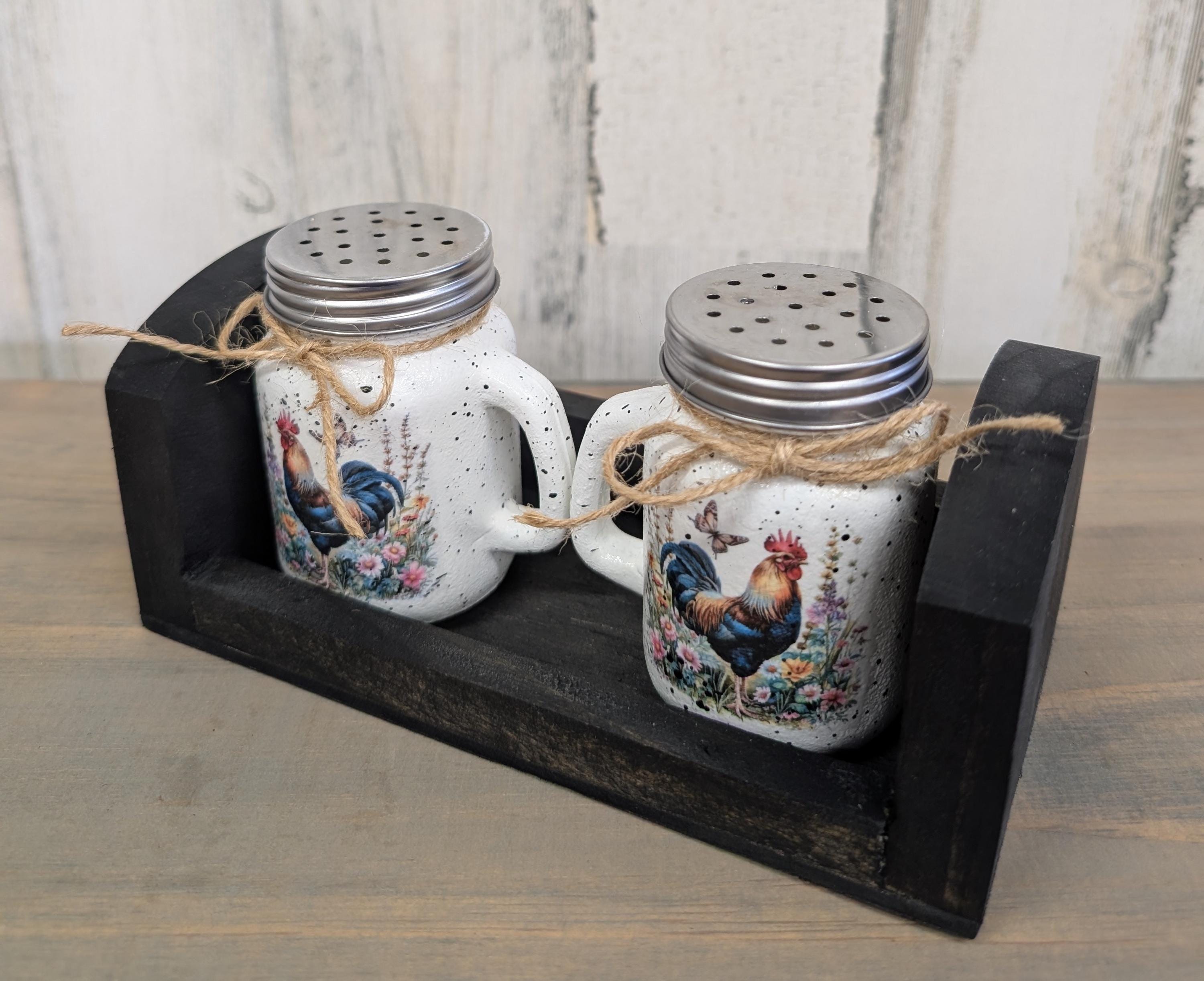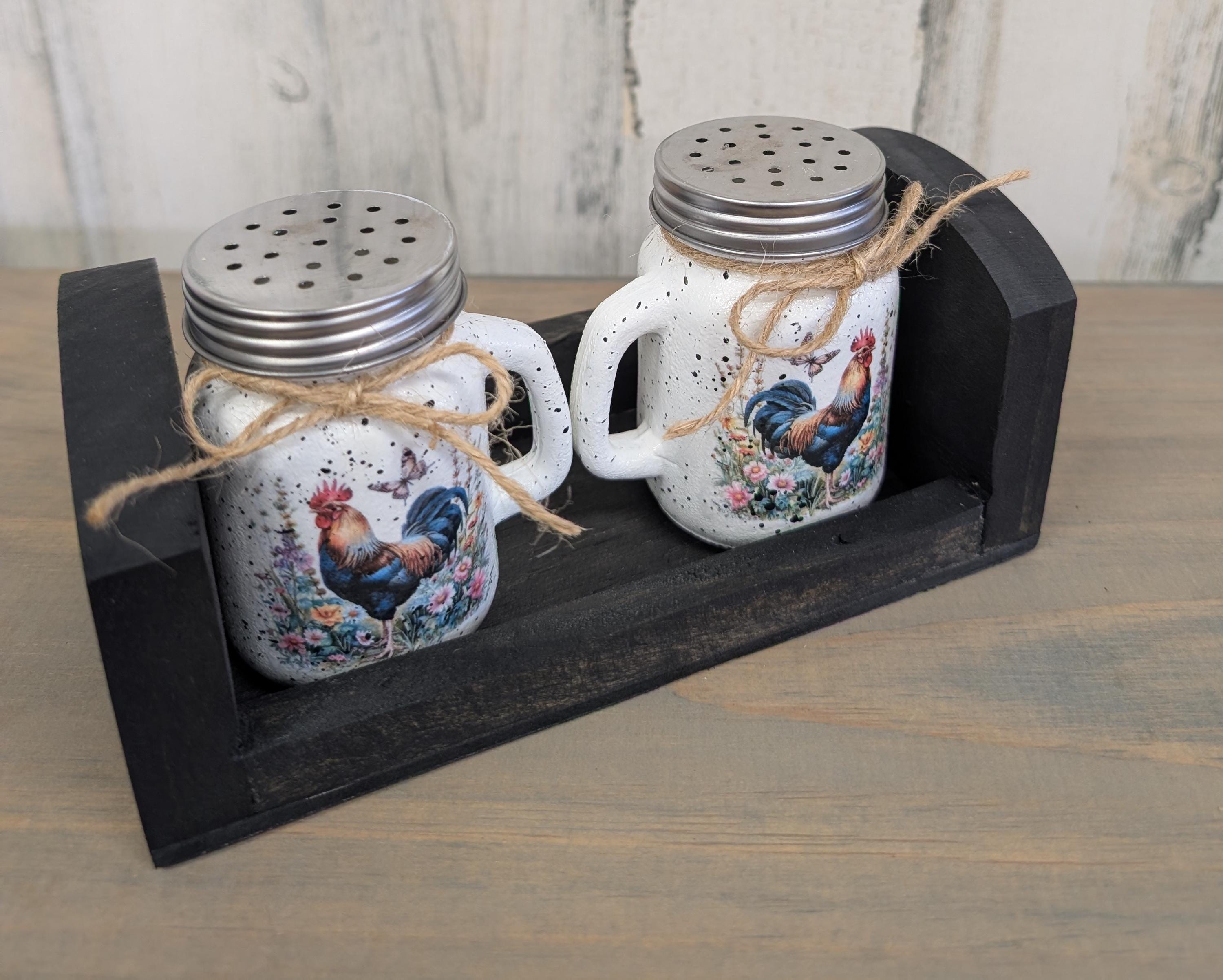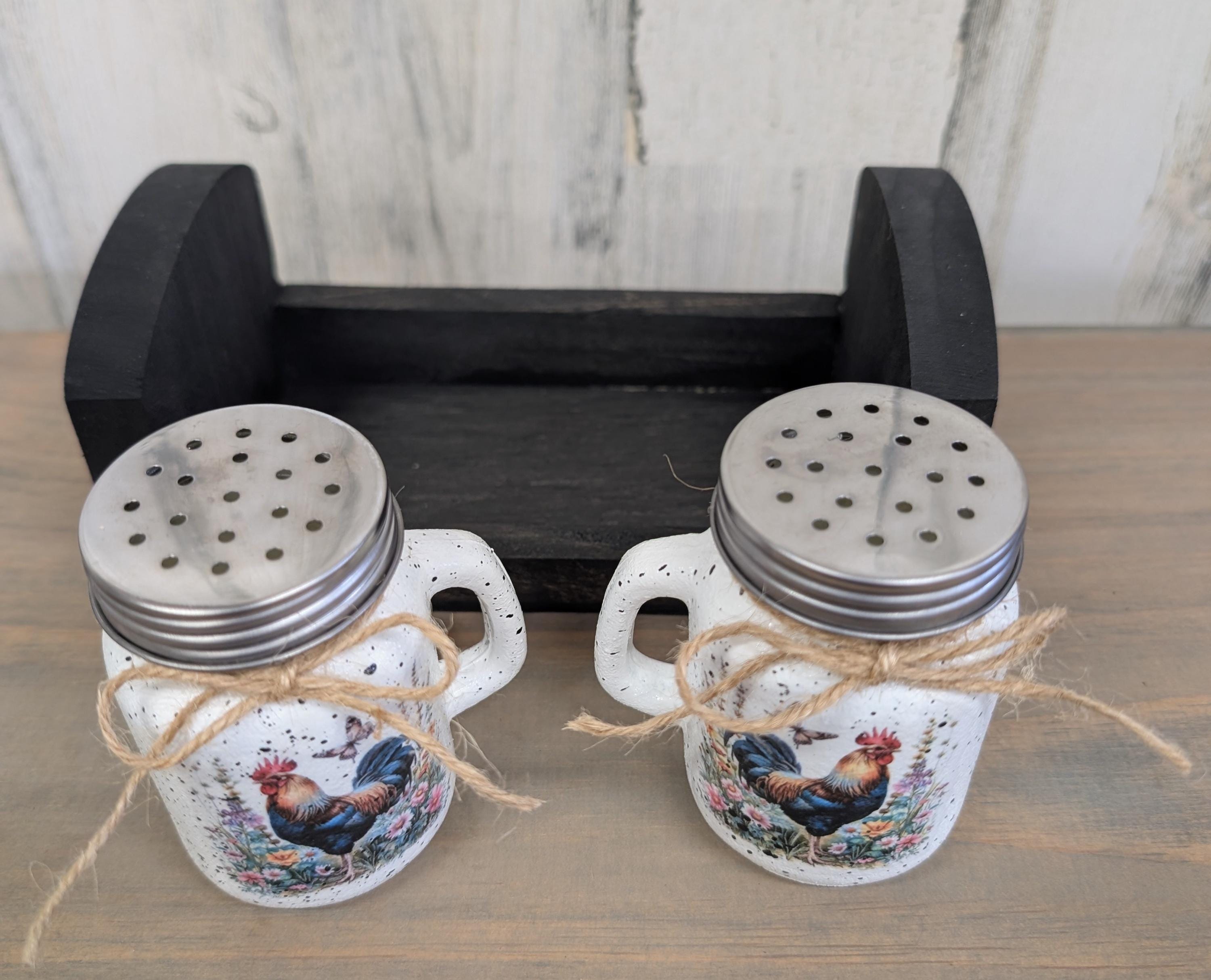 Rooster salt, and pepper shakers with wooden holder. This adorable little salt and pepper shaker set is hand painted using chalk paint. The roosters are applied using the decoupage technique. Several coats of a gloss varnish is applied. The little wooden holder is handmade, and stained ebony. This set would look great in any kitchen or make a wonderful gift.