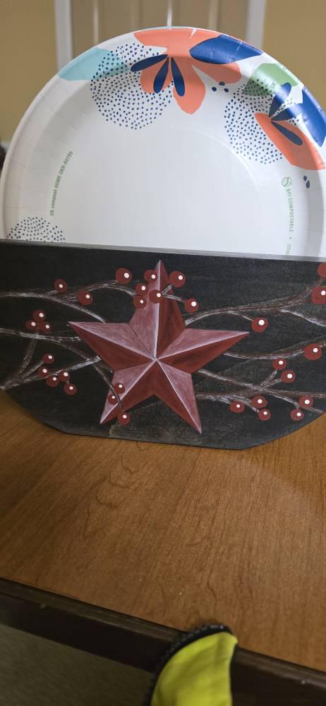 Paper Plate Holder, hand made from pine wood, and dowel rods. It is stained with ebony stain. A Primitive Star, and berry vines are then Hand Painted by me using acrylic paints. A latex sealer is then applied to keep it beautiful for years to come. Wood Glue, and Brad nails are used to securely hold it together. It will hold the larger paper plates. The height is 11", width is 4", and the length is 12" This Primitive Paper Plate Holder would look great in any kitchen or it would make a lovely gift for Family or Friends.