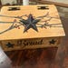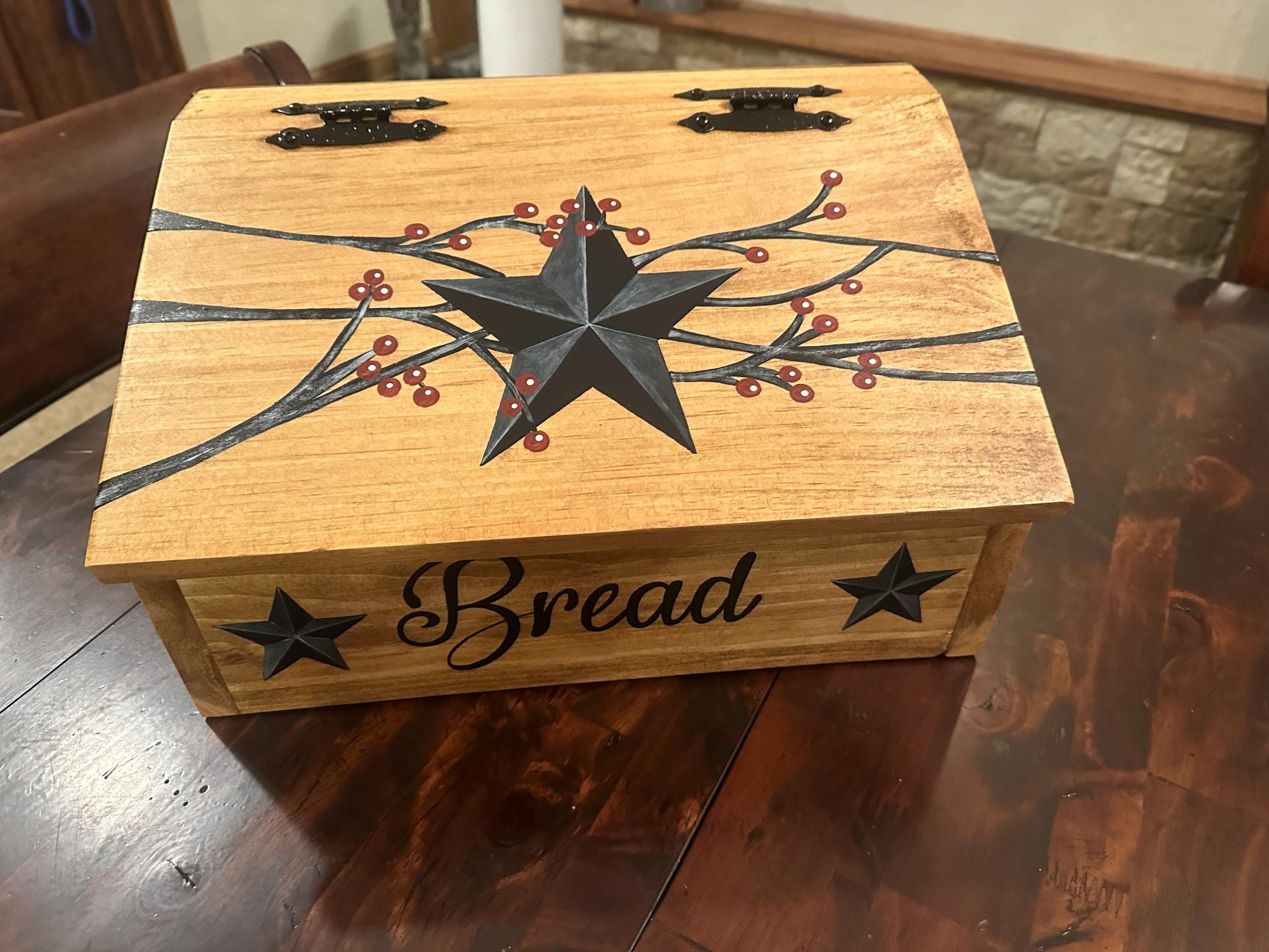 Bread Box, This Primitive Bread Box is hand made using knotty pine wood, and black hammered hinges. It is securely held together with brad nails, and wood glue. It is stained early American. The primitive star and berry vines are hand painted by me, using acrylic paints, and then a latex sealer is applied. The length is 15.5", width is 10.5", and the height is 8.75" This Country Primitive bread box will hold two loaves of regular sized bread.