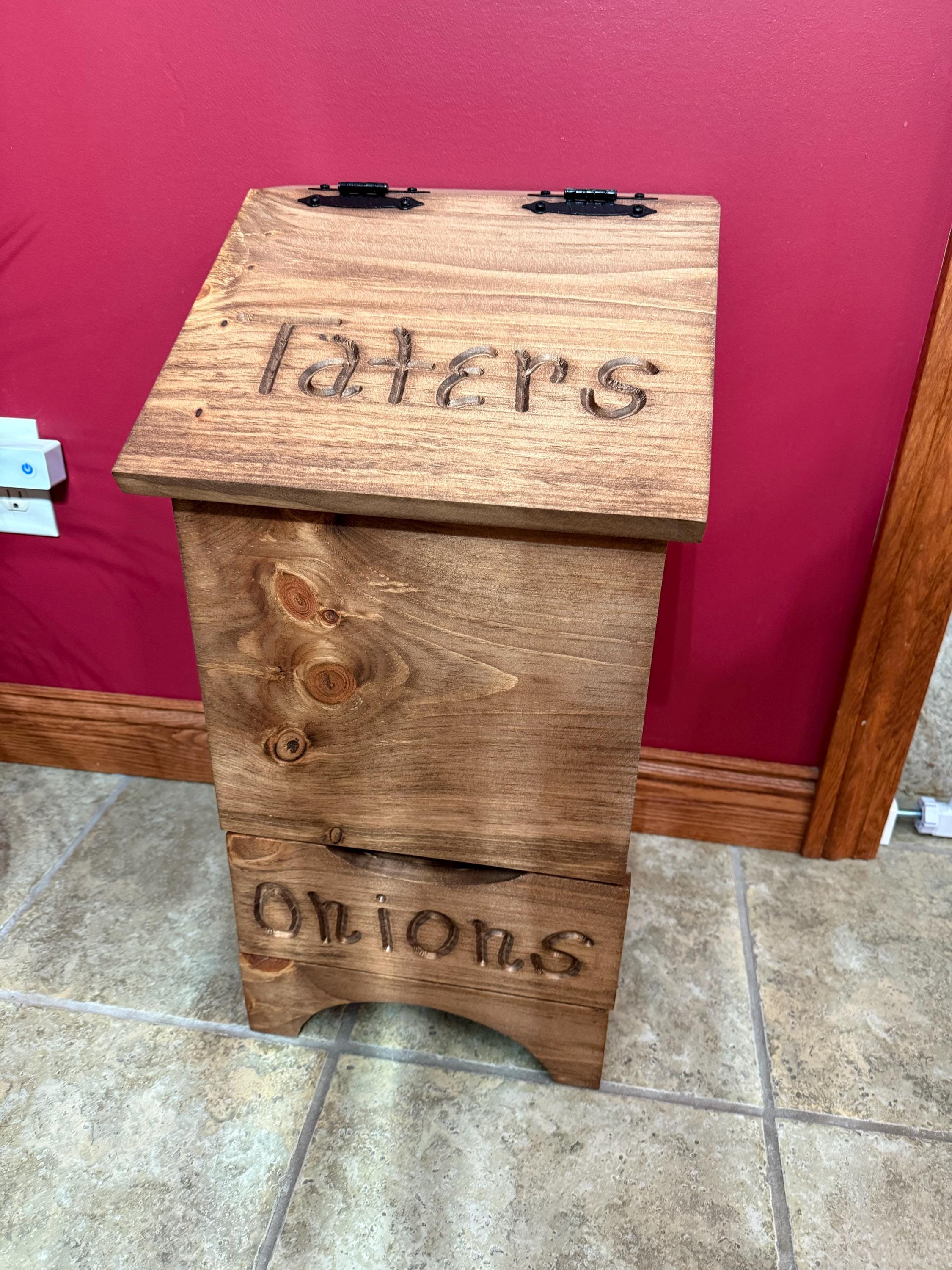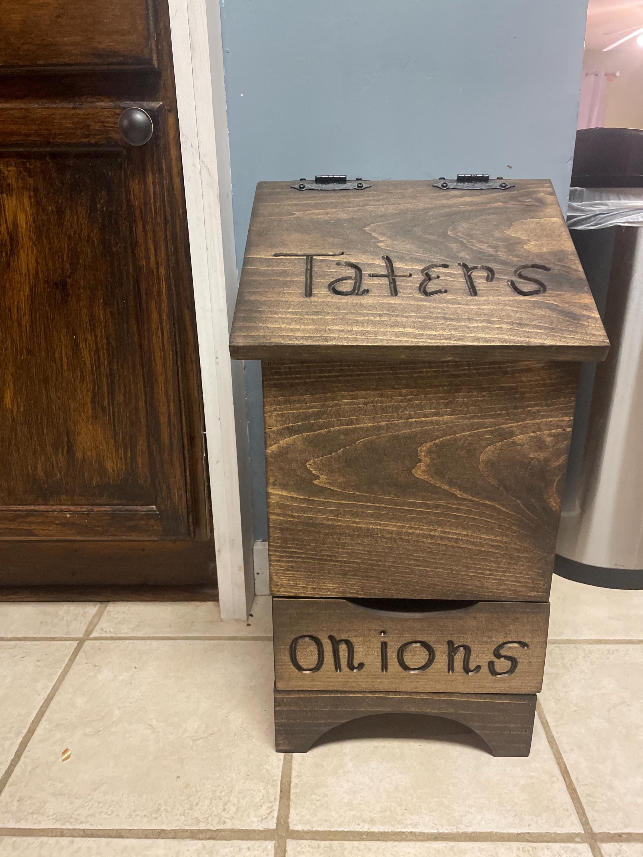 Potato, and Onion Bin. This rustic primitive potato and onion bin is hand made from knotty pine wood, and black hammered hinges. It is stained Early American. There are several imperfections in the wood which gives it a more rustic look. Taters is hand routered into the lid, and onions is hand routered into the onion drawer. It is securely held together with wood glue and brad nails. The onion and potato compartment is separated with plywood, and the back is luan plywood with several air holes. The height is 24", the width is 11.25", and the depth is 12". It will hold a 10lb bag of potatoes, and the onion drawer will hold approximately 4 to 5 large onions. This rustic potato and onion bin would make a lovely addition to your kitchen for storing your potatoes, and onions. Or it would make a wonderful Mother's Day Gift.