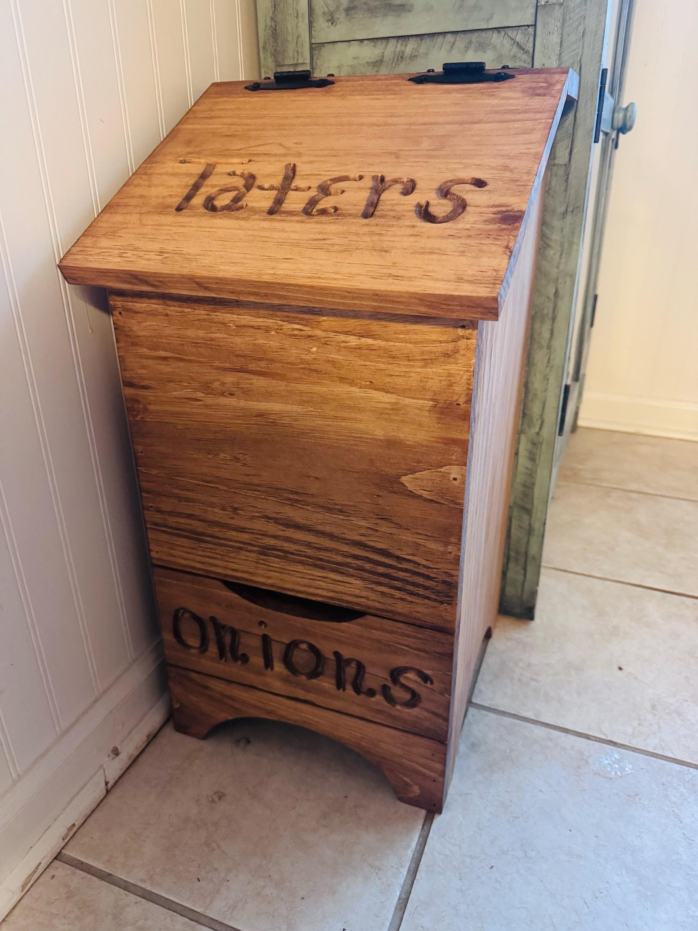 Potato, and Onion Bin. This rustic primitive potato and onion bin is hand made from knotty pine wood, and black hammered hinges. It is stained Early American. There are several imperfections in the wood which gives it a more rustic look. Taters is hand routered into the lid, and onions is hand routered into the onion drawer. It is securely held together with wood glue and brad nails. The onion and potato compartment is separated with plywood, and the back is luan plywood with several air holes. The height is 24", the width is 11.25", and the depth is 12". It will hold a 10lb bag of potatoes, and the onion drawer will hold approximately 4 to 5 large onions. This rustic potato and onion bin would make a lovely addition to your kitchen for storing your potatoes, and onions. Or it would make a wonderful Mother's Day Gift.