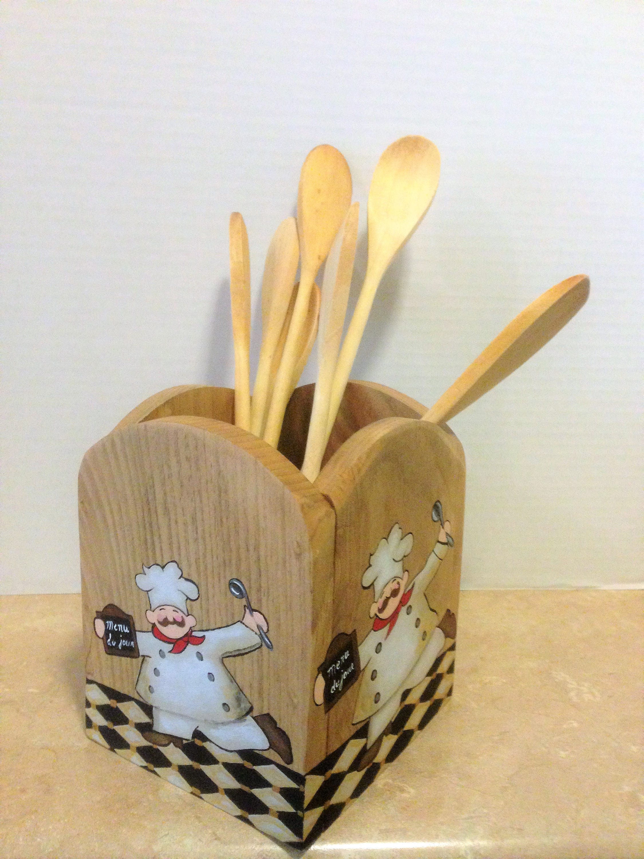 Utensil Holder, This kitchen utensil holder is made from knotty pine wood. It is securely held together with brad nails, and wood glue. It is stained golden oak, and the chef is hand painted using acrylic paints. The painting is on three sides. It measures 5.5" wide and 7" high. This chef utensil holder would look great in any kitchen to hold all your cooking utensils or would make a lovely Mother's Day gift.