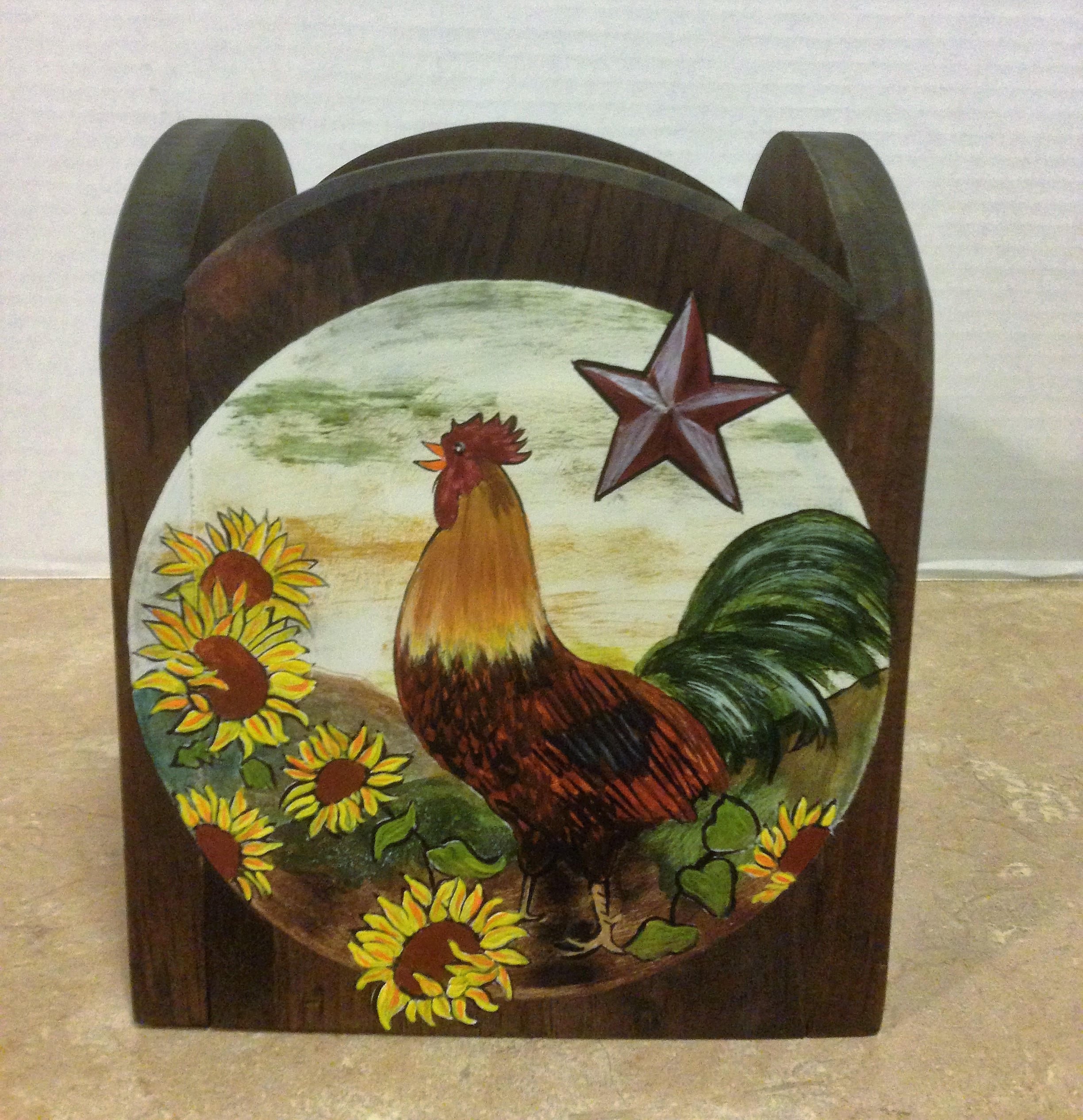 Utensil Holder, This kitchen utensil holder is made from knotty pine wood. It is securely held together with brad nails, and wood glue. It is stained dark walnut, and the rooster, and stars are hand painted using acrylic paints. The painting is on three sides. The rooster on the front, and the primitive stars on each side. It measures 5.5" wide and 7" high. This rooster utensil holder would look great in any kitchen to hold all your cooking utensils or would make a lovely housewarming gift.