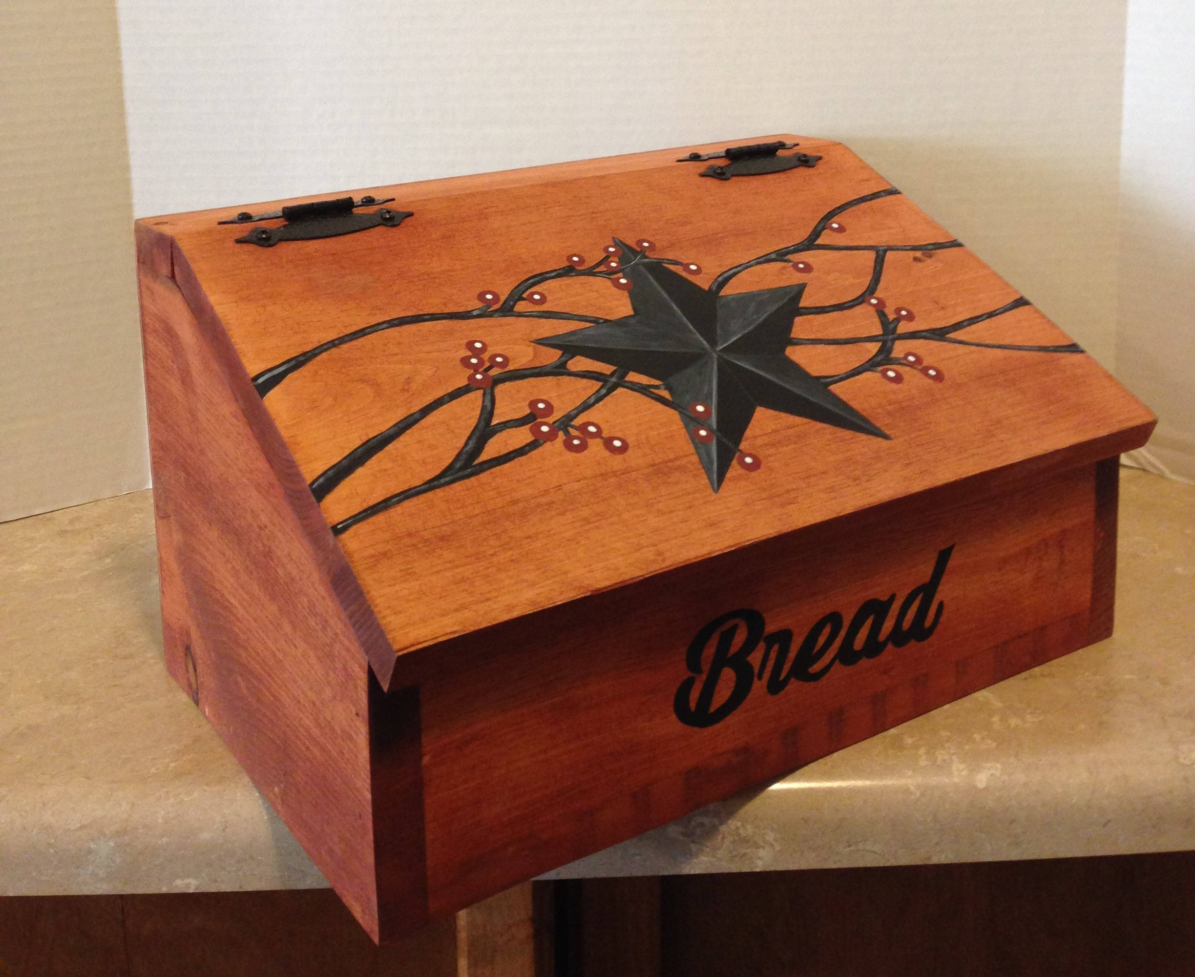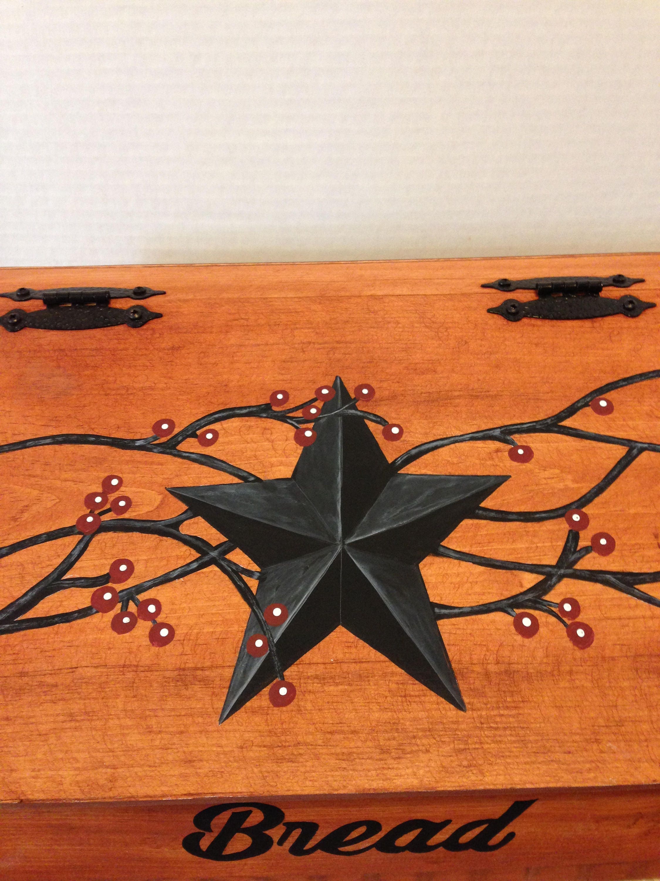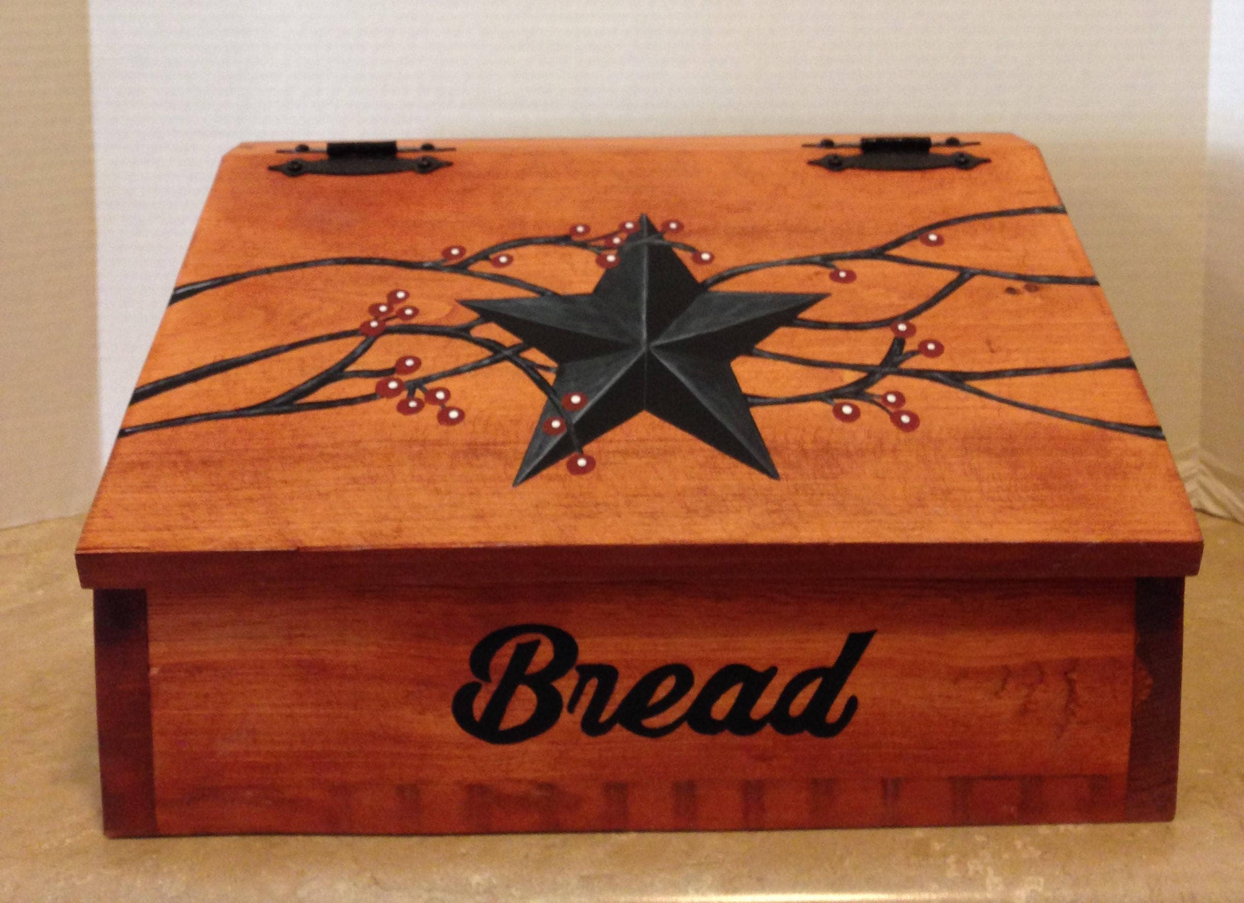 Bread Box, This Wooden Bread Box is hand made using knotty pine wood, and black hammered hinges. It is securely held together with brad nails, and wood glue. It is stained gunstock. The primitive star, and berry vines are hand painted by me, using acrylic paints, and then a latex protective finish is applied. The length is 15.5", width is 10.5", and the height is 8.75" This bread box will easily hold two loaves of regular sized bread.