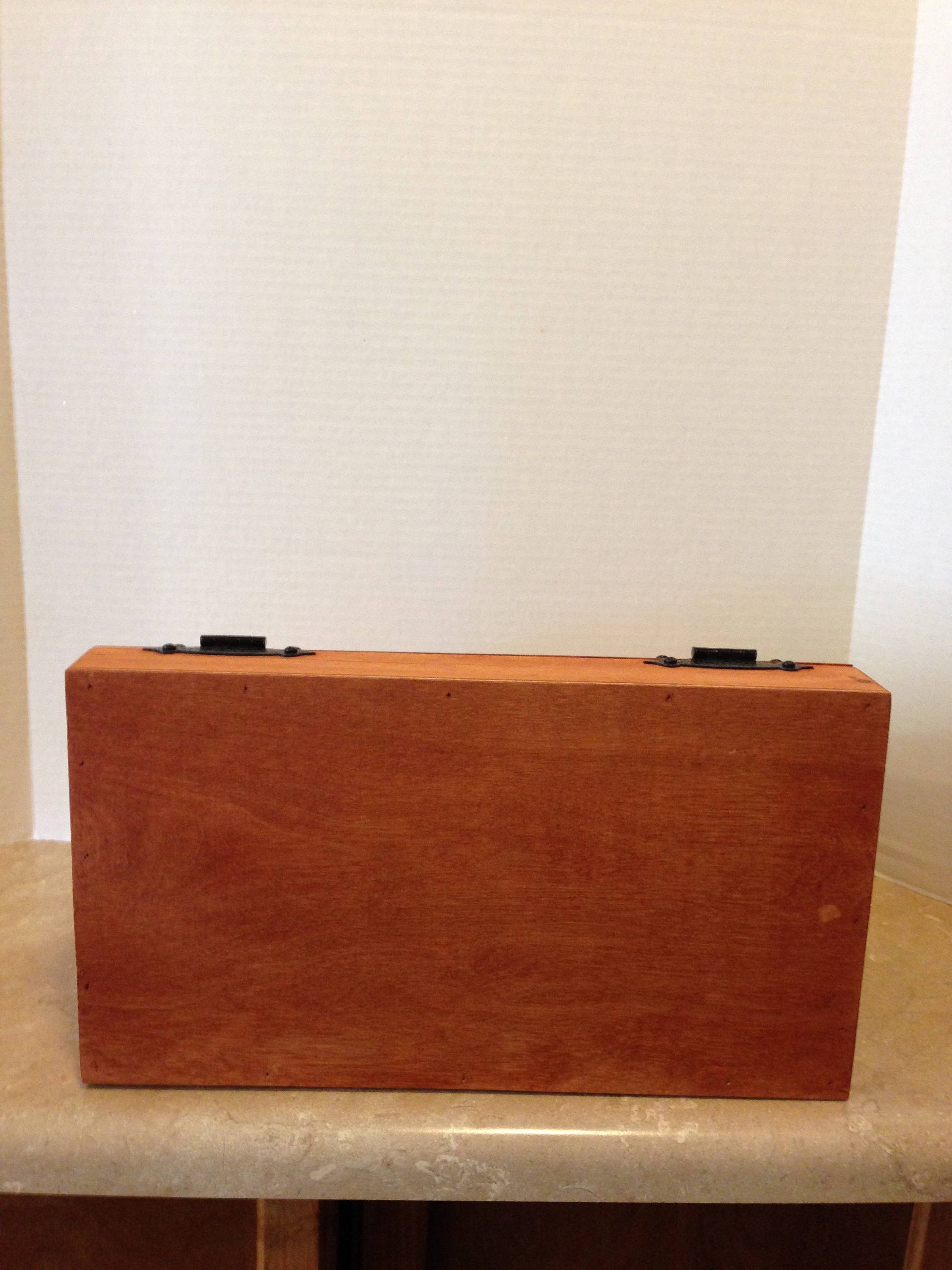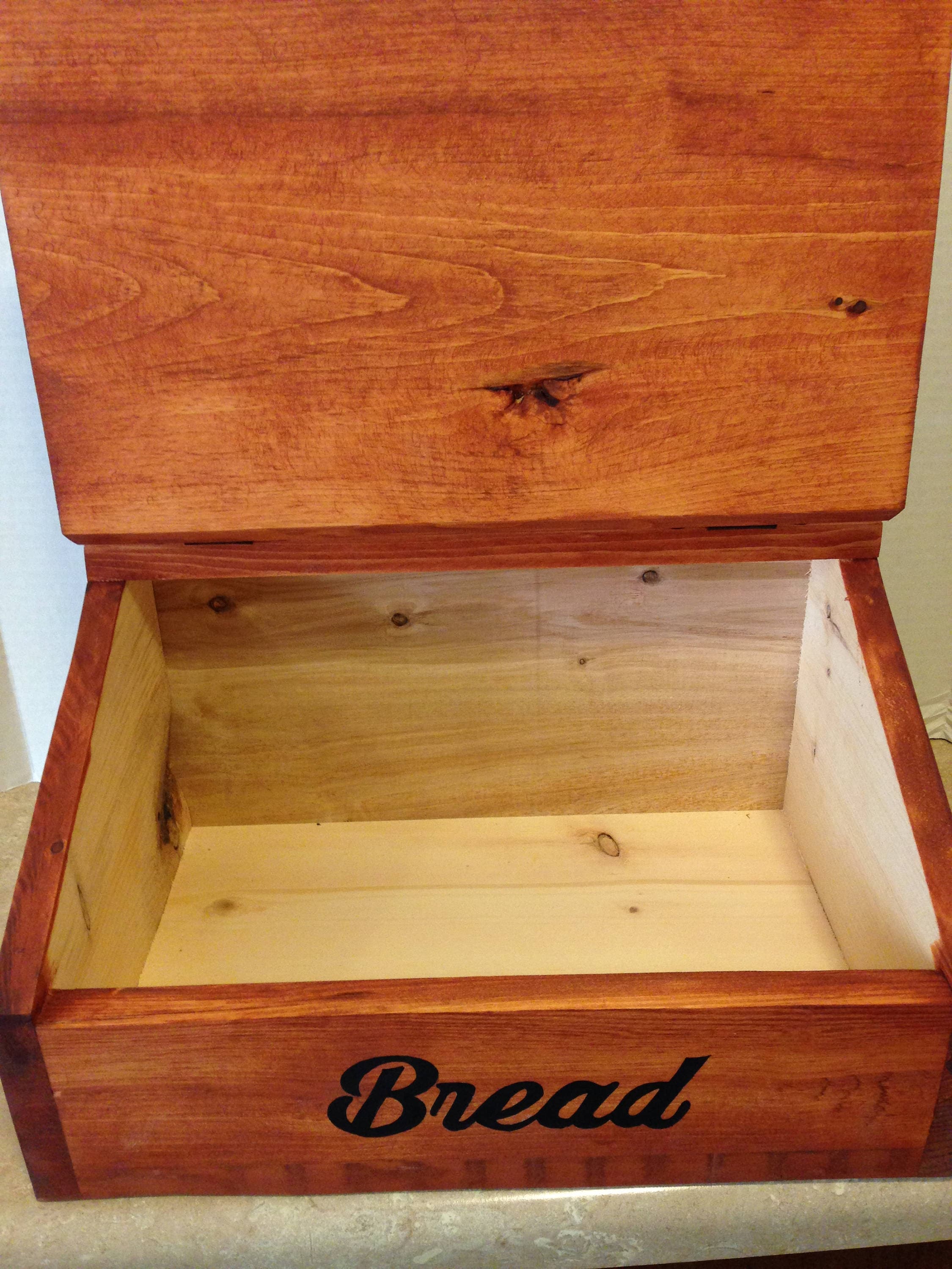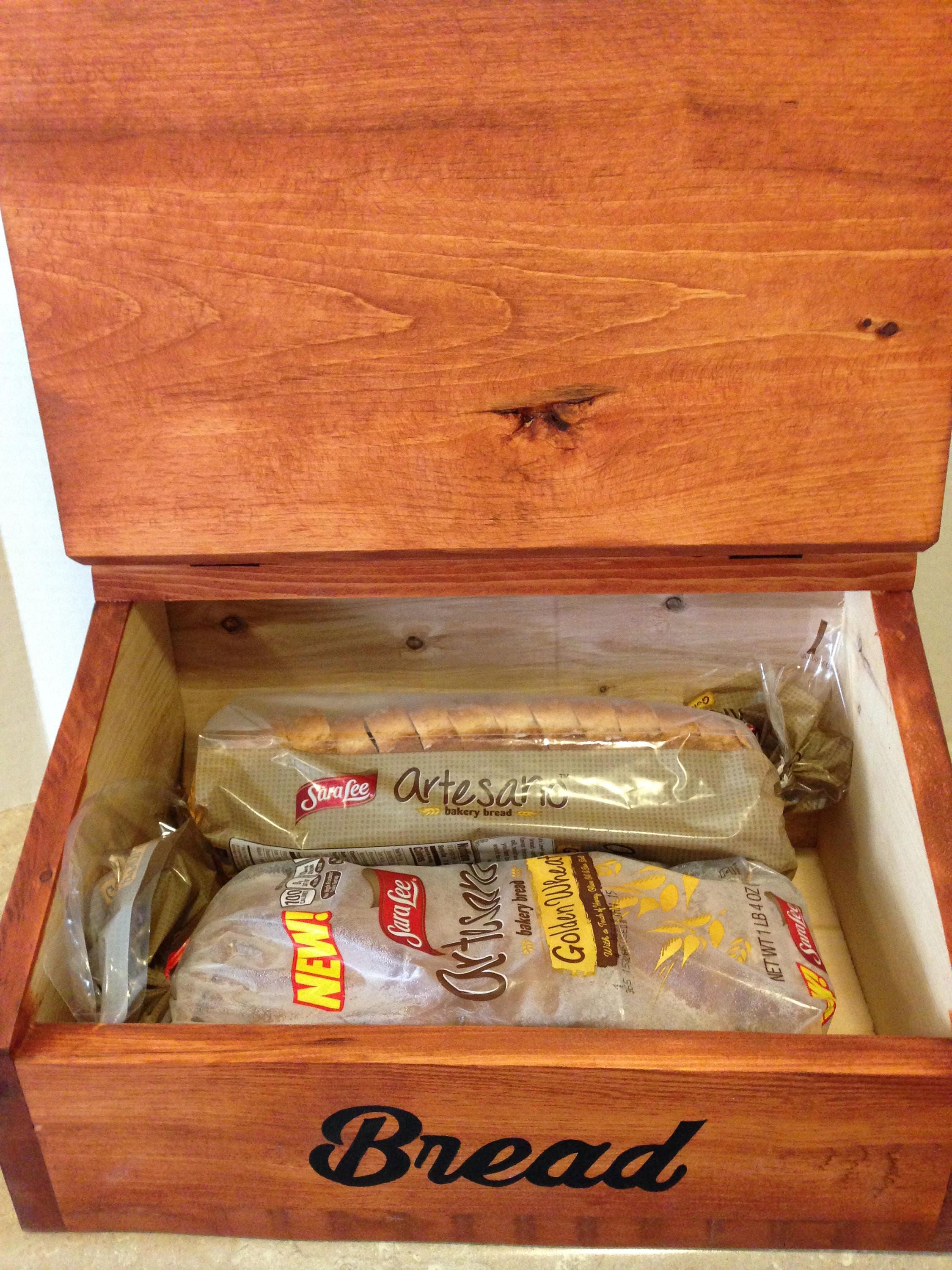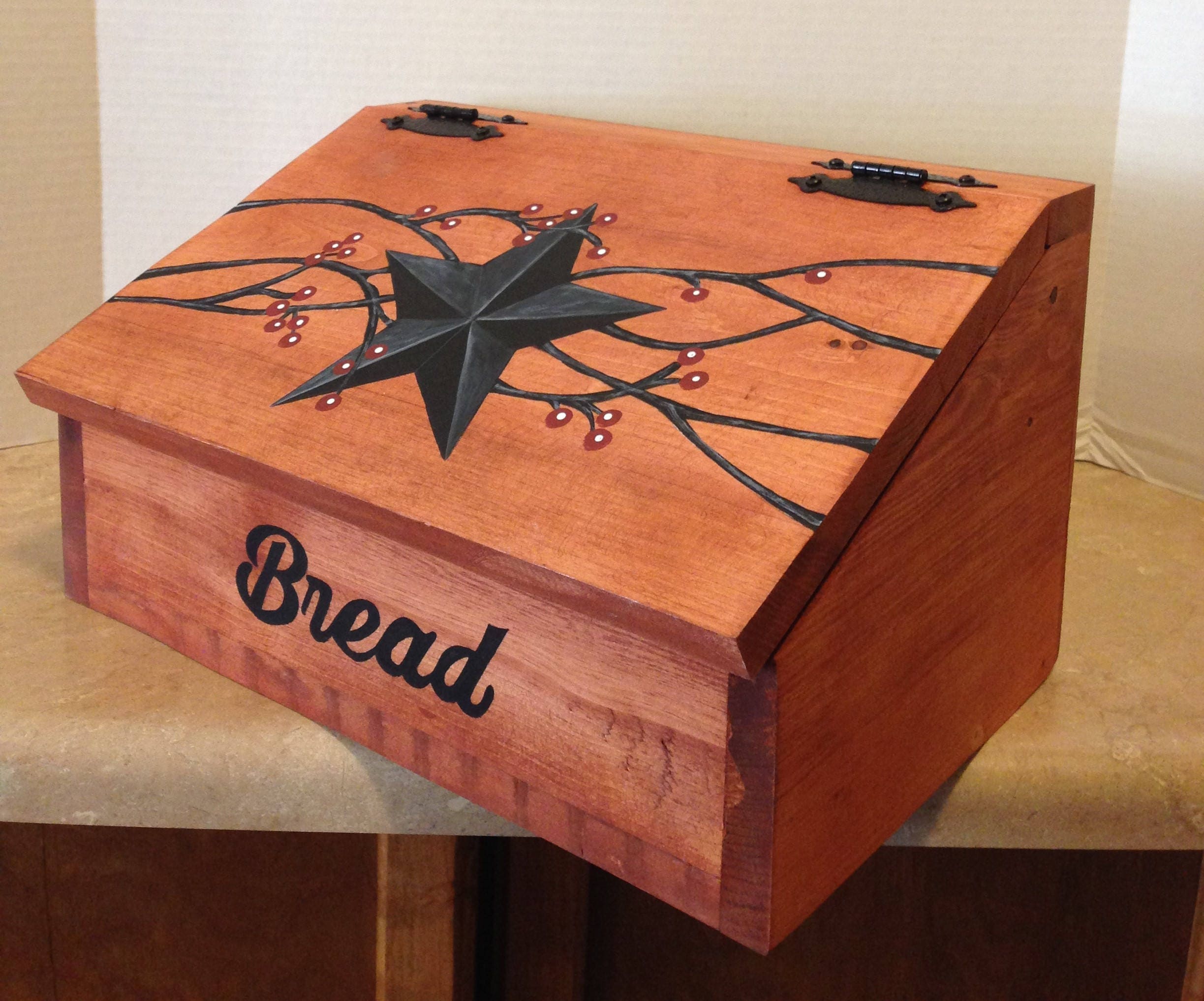 Bread Box, This Wooden Bread Box is hand made using knotty pine wood, and black hammered hinges. It is securely held together with brad nails, and wood glue. It is stained gunstock. The primitive star, and berry vines are hand painted by me, using acrylic paints, and then a latex protective finish is applied. The length is 15.5", width is 10.5", and the height is 8.75" This bread box will easily hold two loaves of regular sized bread.
