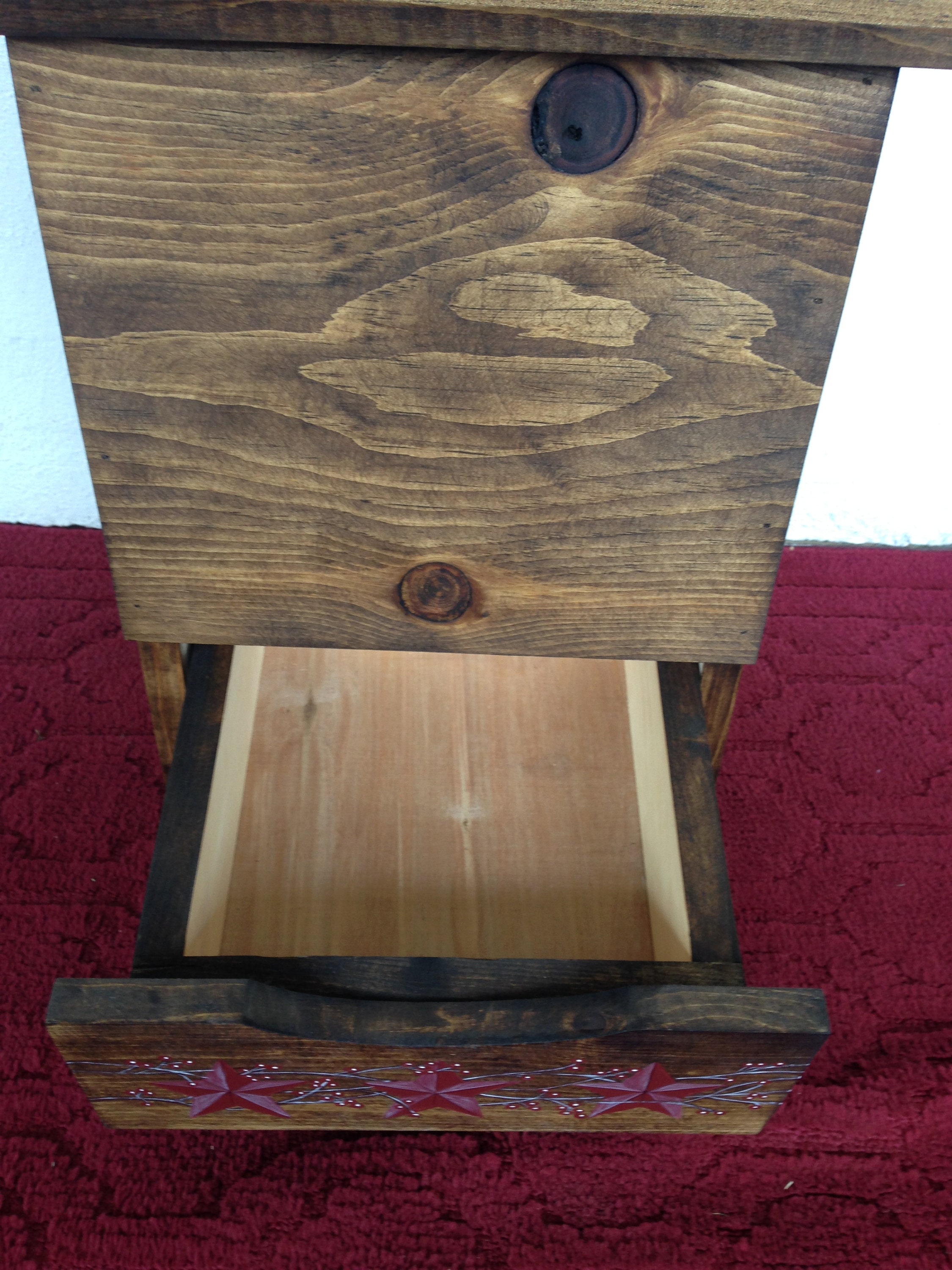 Potato and Onion Bin. This Rustic Primitive Potato and Onion Bin is made from knotty pine wood, and Black Hammered Hinges. It is stained a dark walnut. Wood Glue and Brad Nails securely hold it together. The Primitive Stars and Berry Vines are hand painted by me using acrylic paints, and then a coat of latex sealer is applied. There may be some imperfections in the wood, which gives it a more primitive look. The potato compartment is seperated from the onion compartment with plywood, and the back is luan plywood with several air holes drilled into it. The height is 24", the width is 11.25", and the debth is 12". It will hold a 10lb bag of potatoes. The onion drawer is 11"x 8'x 3.5". It will hold approximately 4 to 5 onions. This potato, and onion bin would make a great addition to your kitchen. It would also make a great Mothers Day gift, or a great gift for any occasion.