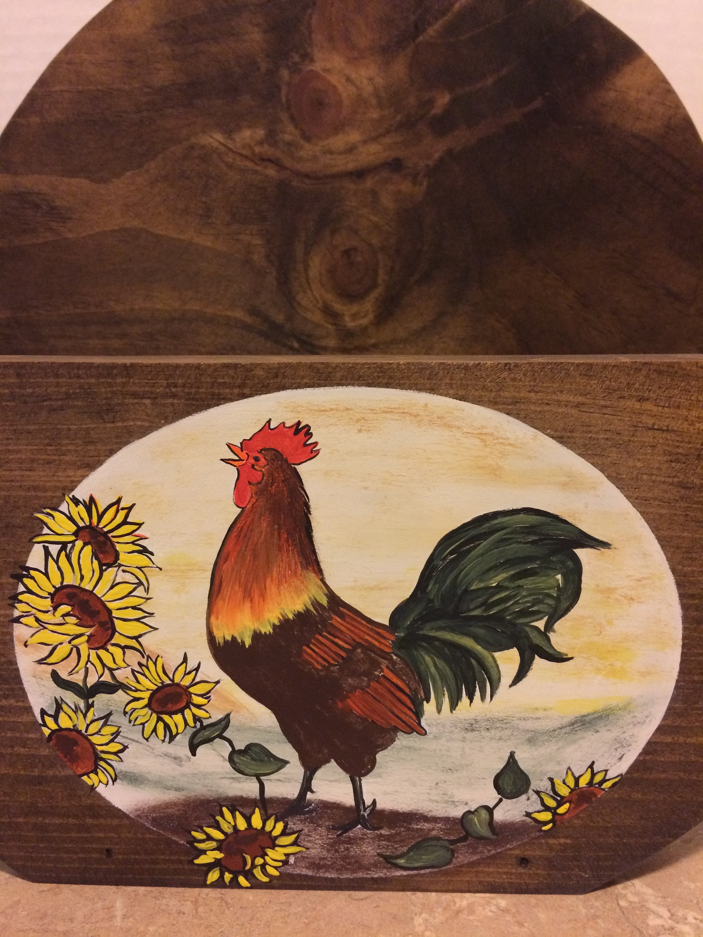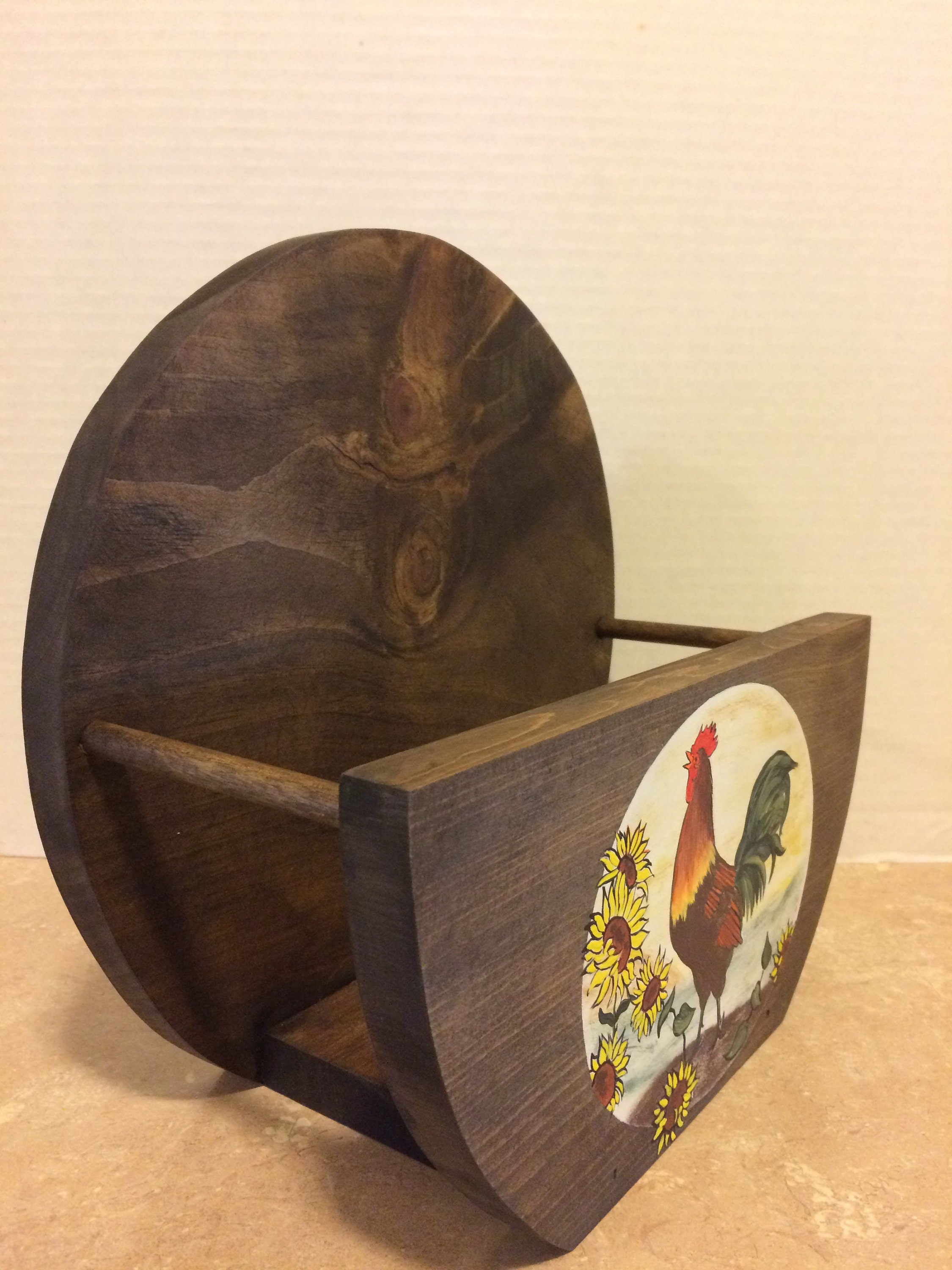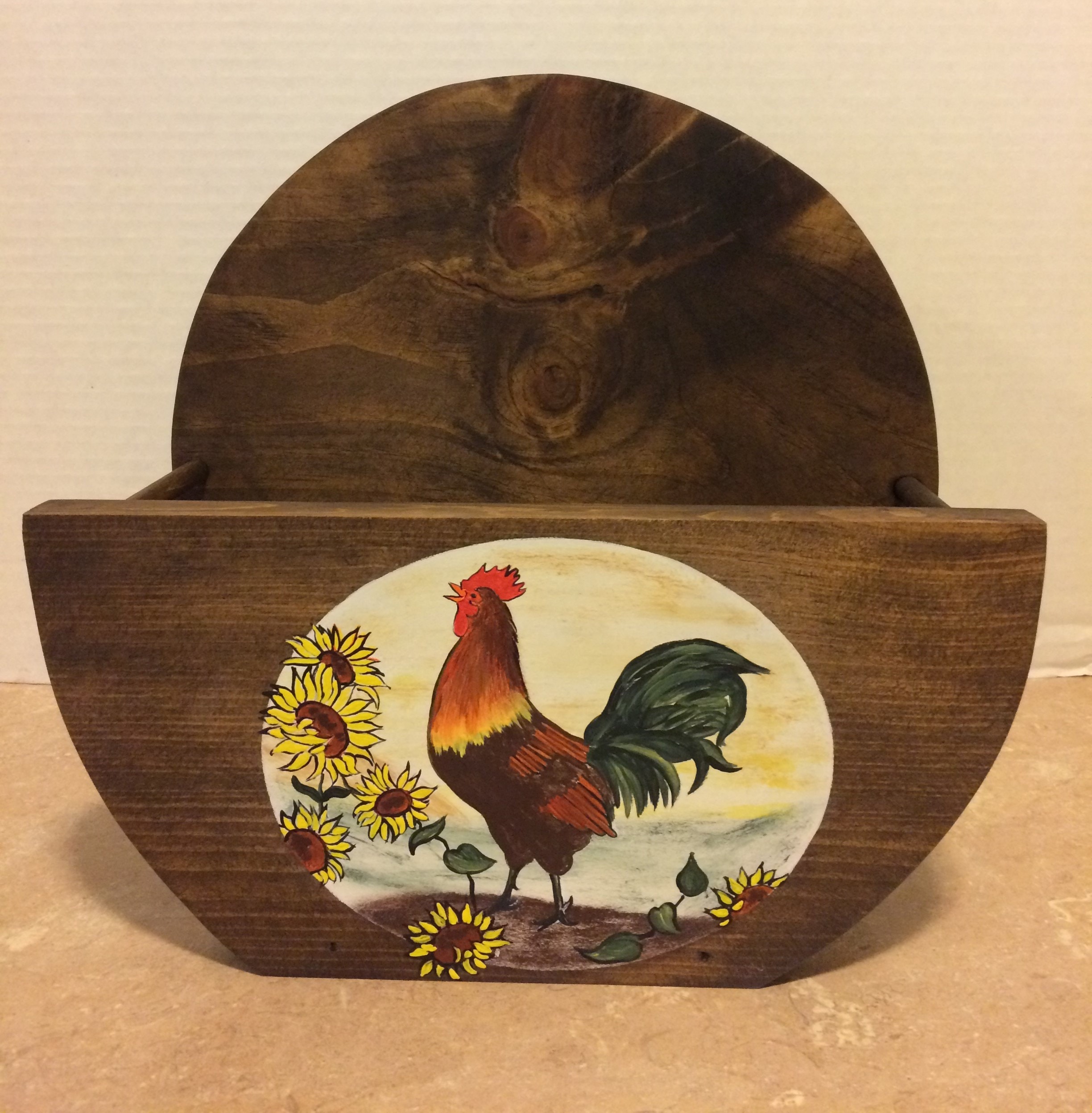 Paper Plate Holder, hand made from pine wood, and dowel rods. It is stained with a dark walnut stain. This rooster plate holder has knots in the wood which gives it a more distressed, primitive look. A Rooster, and Sunflowers are then Hand Painted by me using acrylic paints. A latex sealer is then applied to keep it beautiful for years to come. Wood Glue, and Brad nails are used to securely hold it together. It will hold the larger paper plates. The height is 11", width is 4", and the length is 12" This Rooster Paper Plate Holder would look great in any kitchen or it would make a lovely gift for Family or Friends.