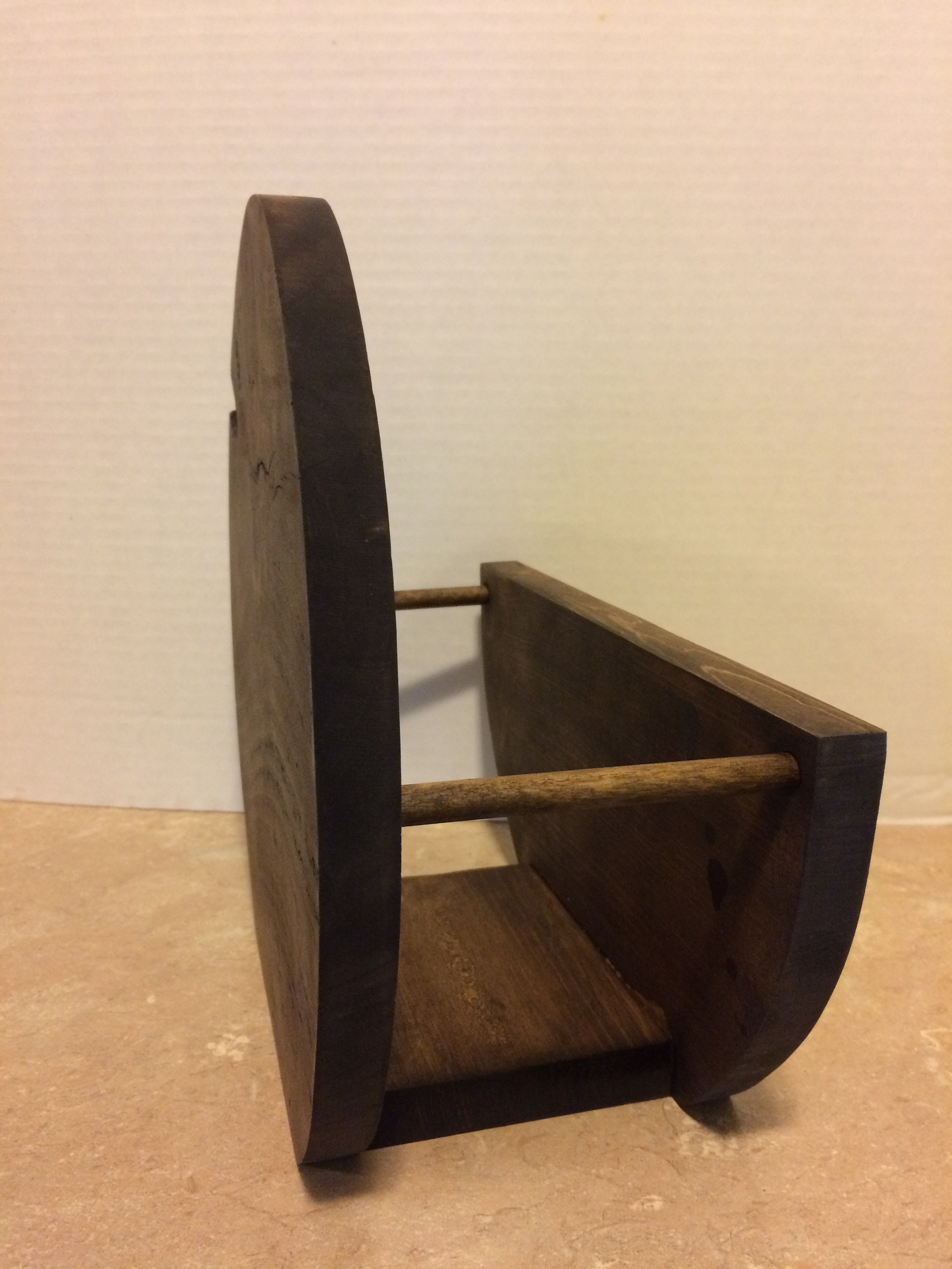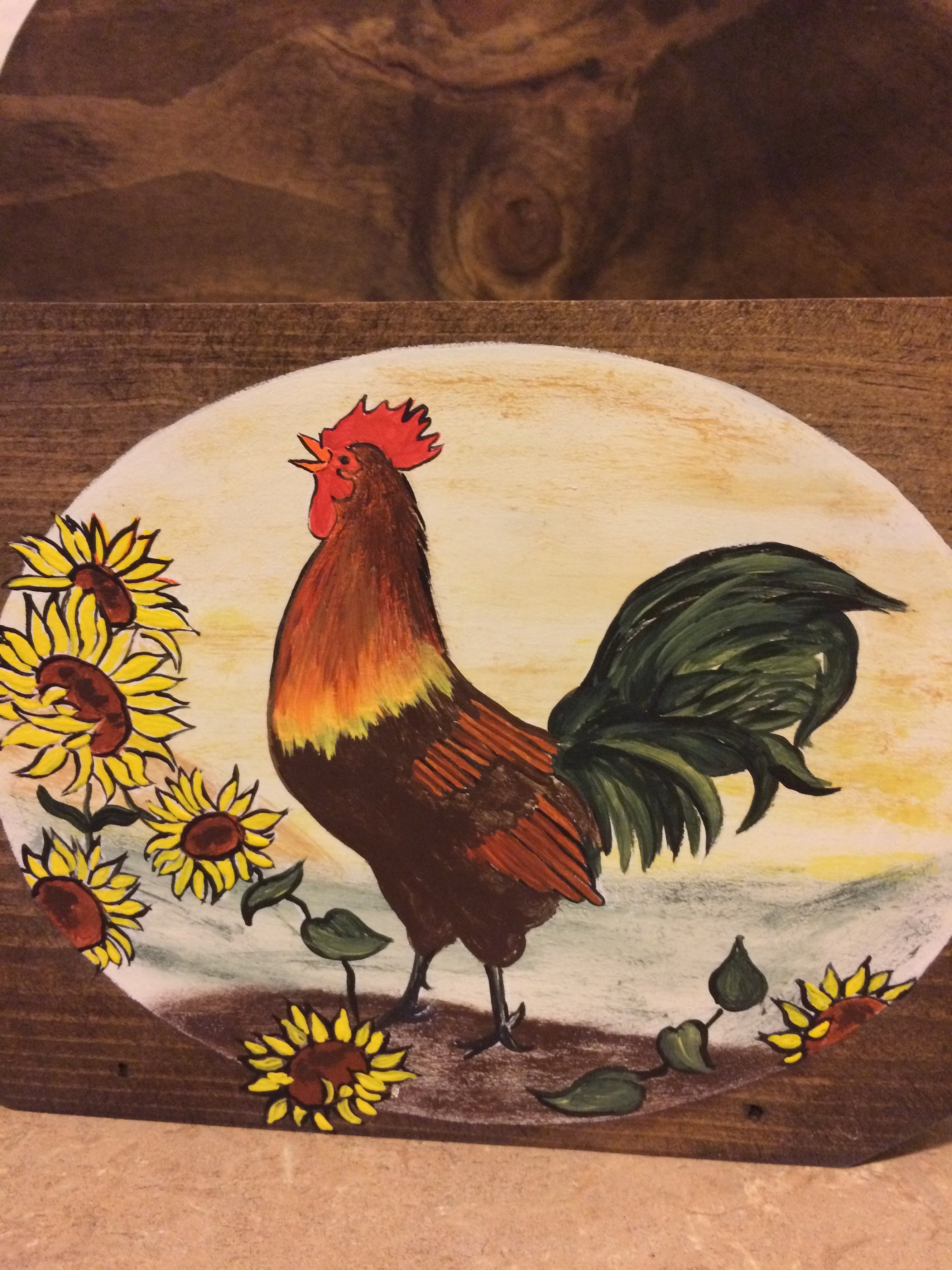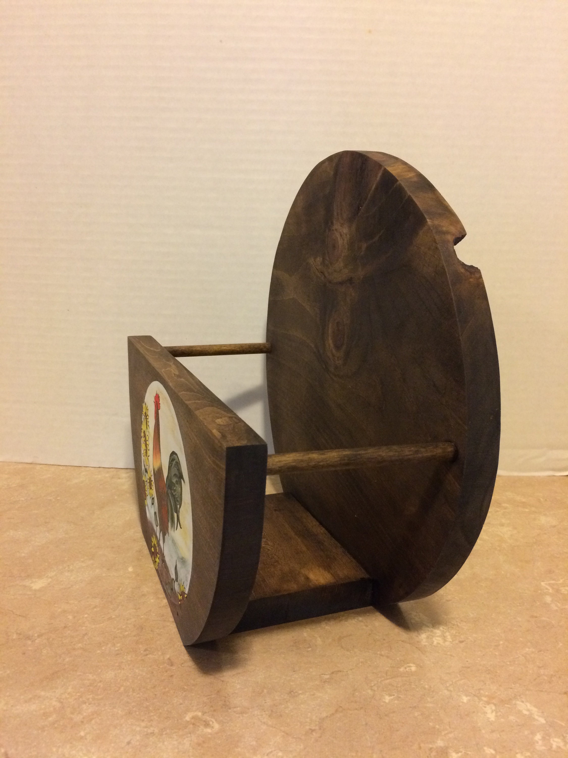 Paper Plate Holder, hand made from pine wood, and dowel rods. It is stained with a dark walnut stain. This rooster plate holder has knots in the wood which gives it a more distressed, primitive look. A Rooster, and Sunflowers are then Hand Painted by me using acrylic paints. A latex sealer is then applied to keep it beautiful for years to come. Wood Glue, and Brad nails are used to securely hold it together. It will hold the larger paper plates. The height is 11", width is 4", and the length is 12" This Rooster Paper Plate Holder would look great in any kitchen or it would make a lovely gift for Family or Friends.