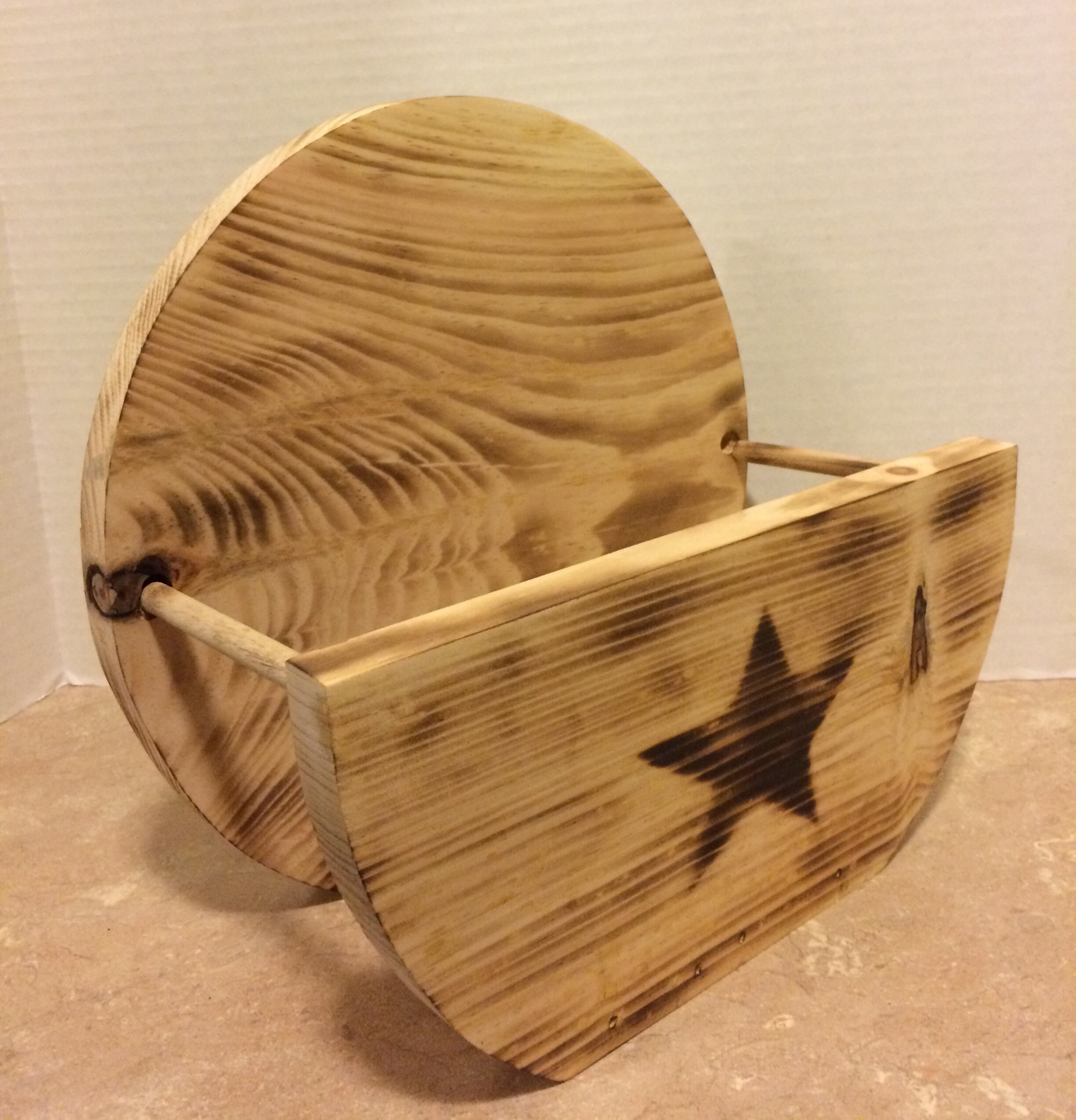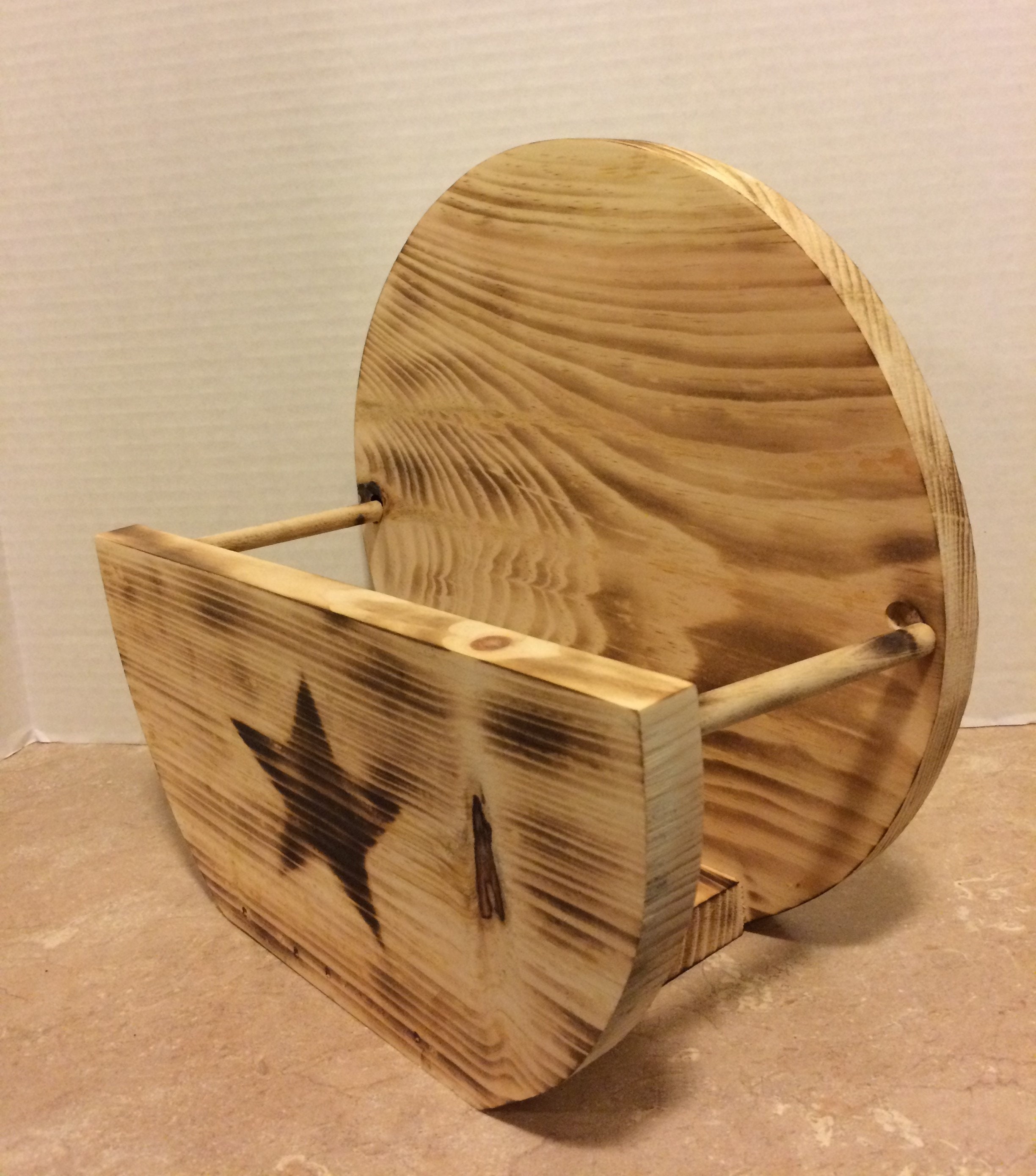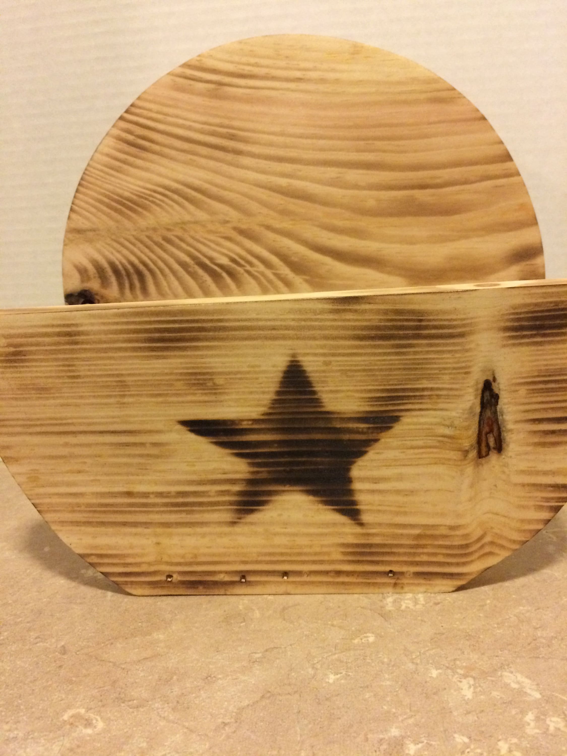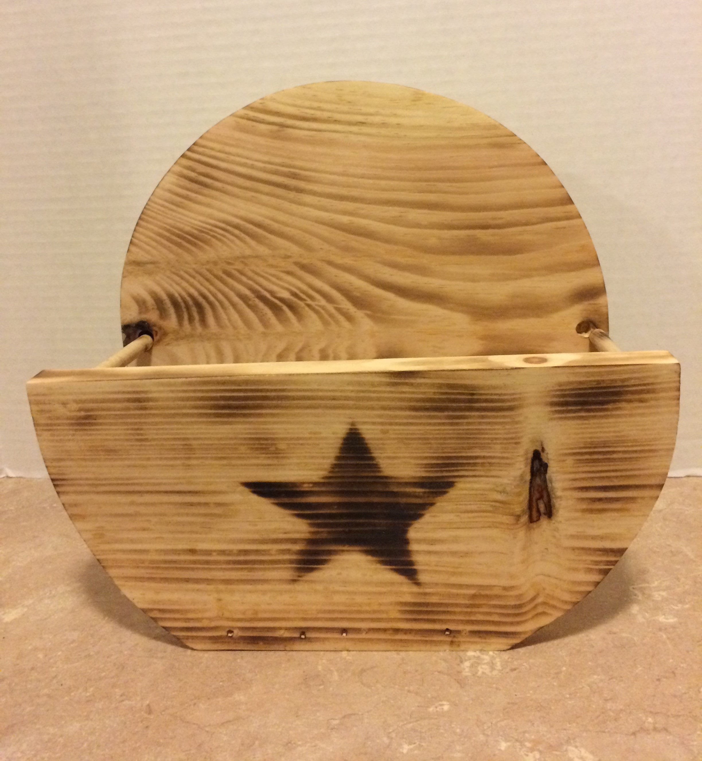 Paper Plate Holder, hand made from pine wood, and dowel rods. This Primitive Paper Plate Holder is lightly burnt with a torch, and then the star is burnt into the wood using a torch. Wood Glue, and Brad nails are used to securely hold it together. It will hold the larger paper plates. The height is 11", width is 4", and the lenght is 12" This Paper Plate Holder would look great in any kitchen or it would make a lovely gift for Family or Friends.