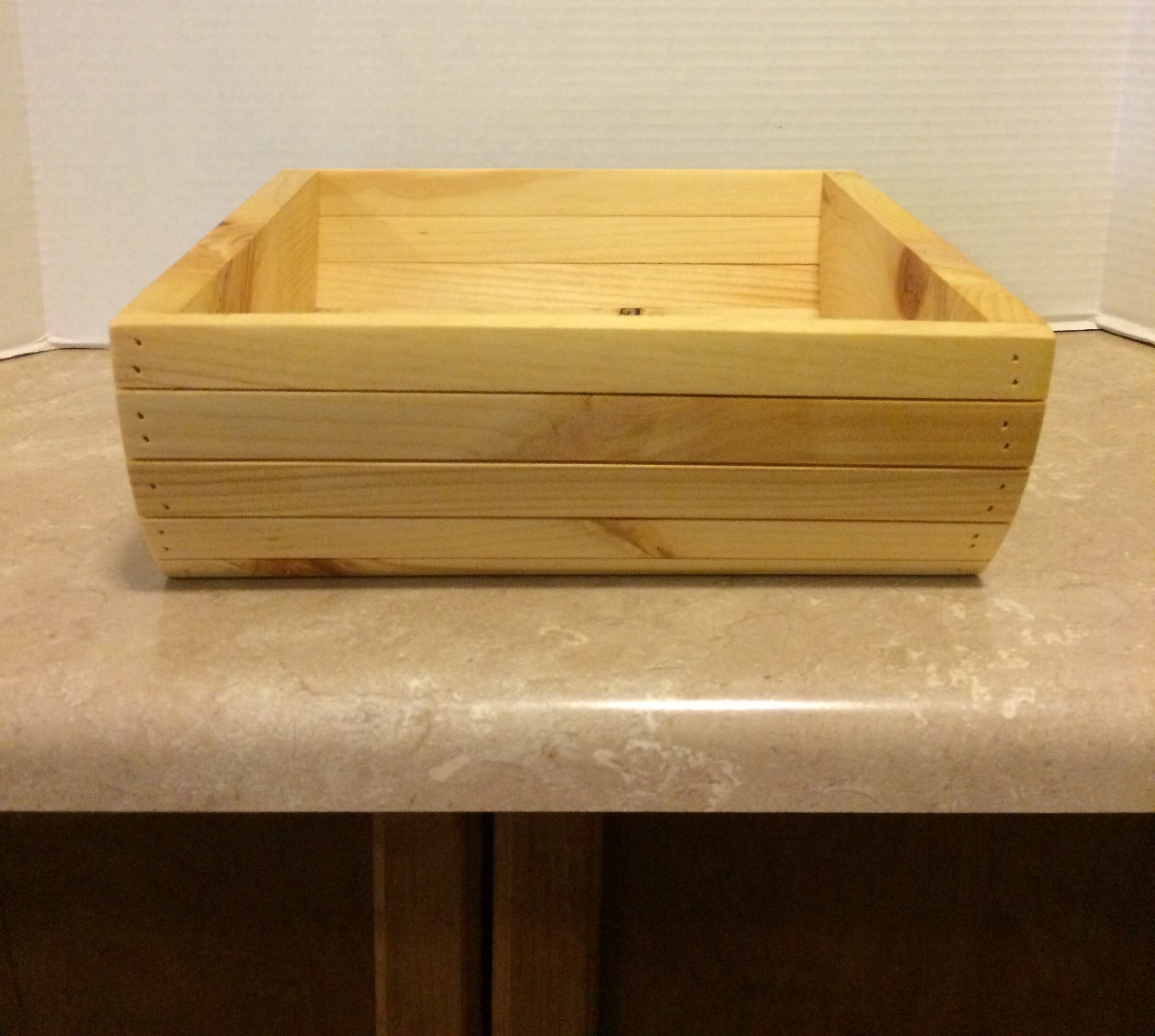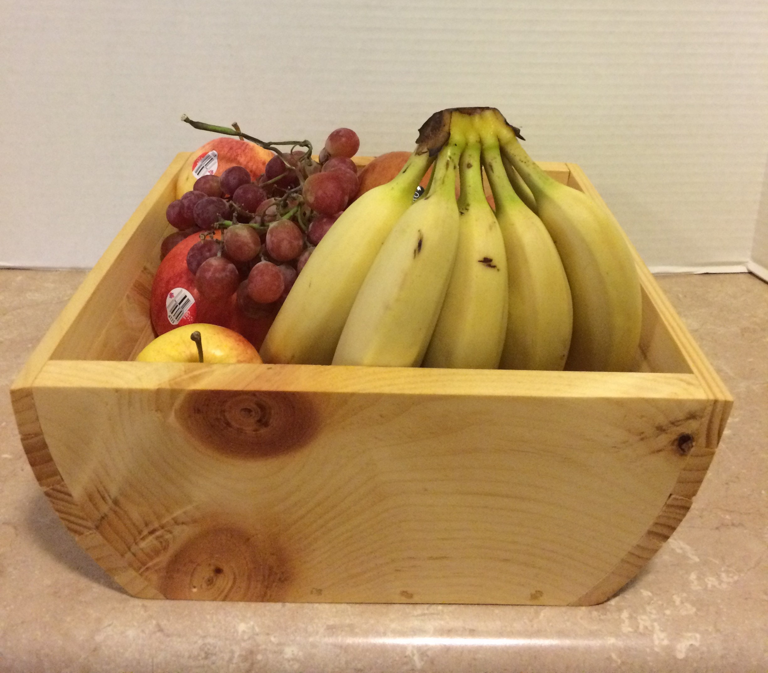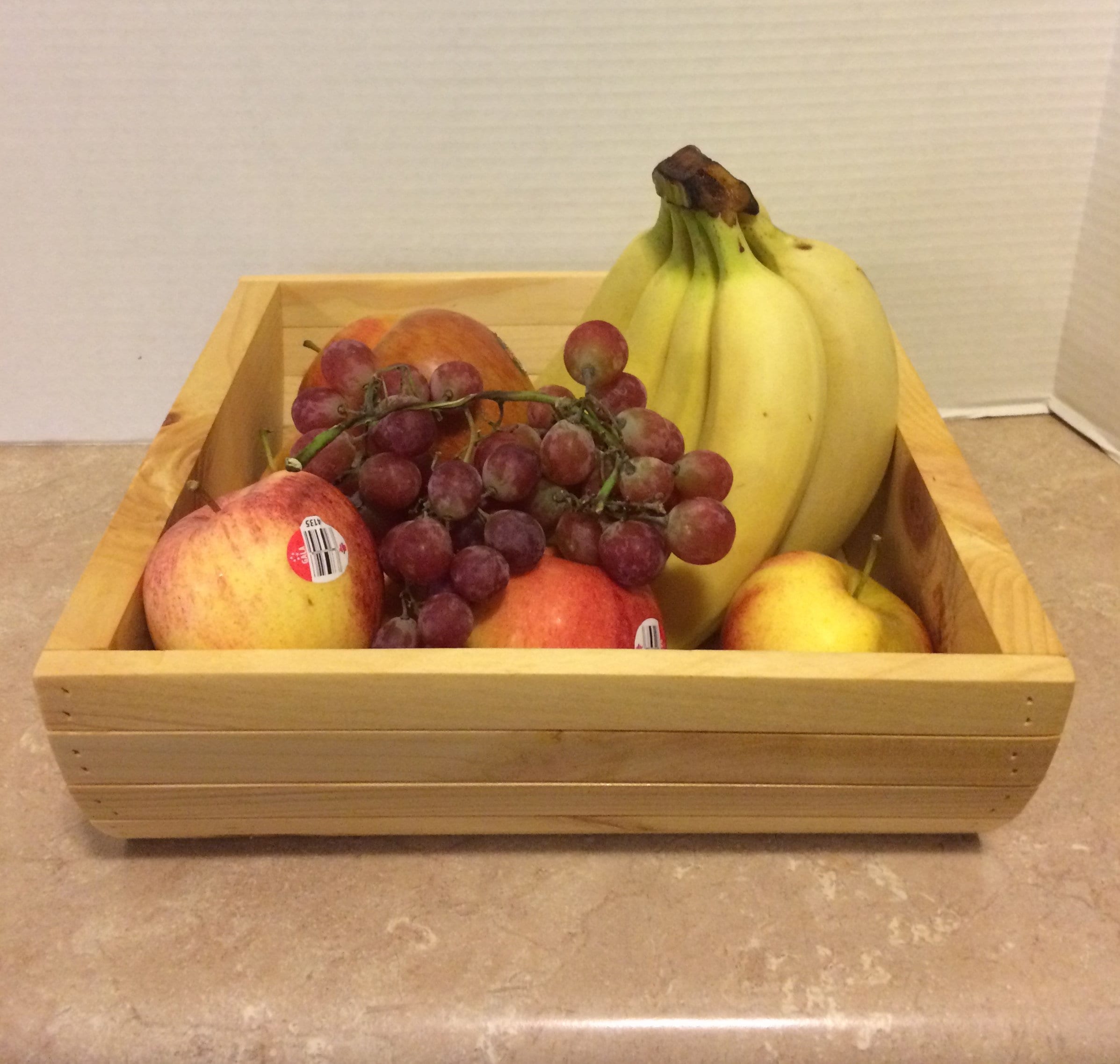 Fruit Basket, This wooden fruit basket is handmade using knotty pine wood. It is securely held together using brad nails, and wood glue. It has two coats of polyurethane. The measurements are 11 1/2 wide x 12" long x 4 1/2" high. It can be used as a fruit basket, or it can be used for dish towels. It can also be used in the bathroom for makeup storage or just about anything you want to store in it.