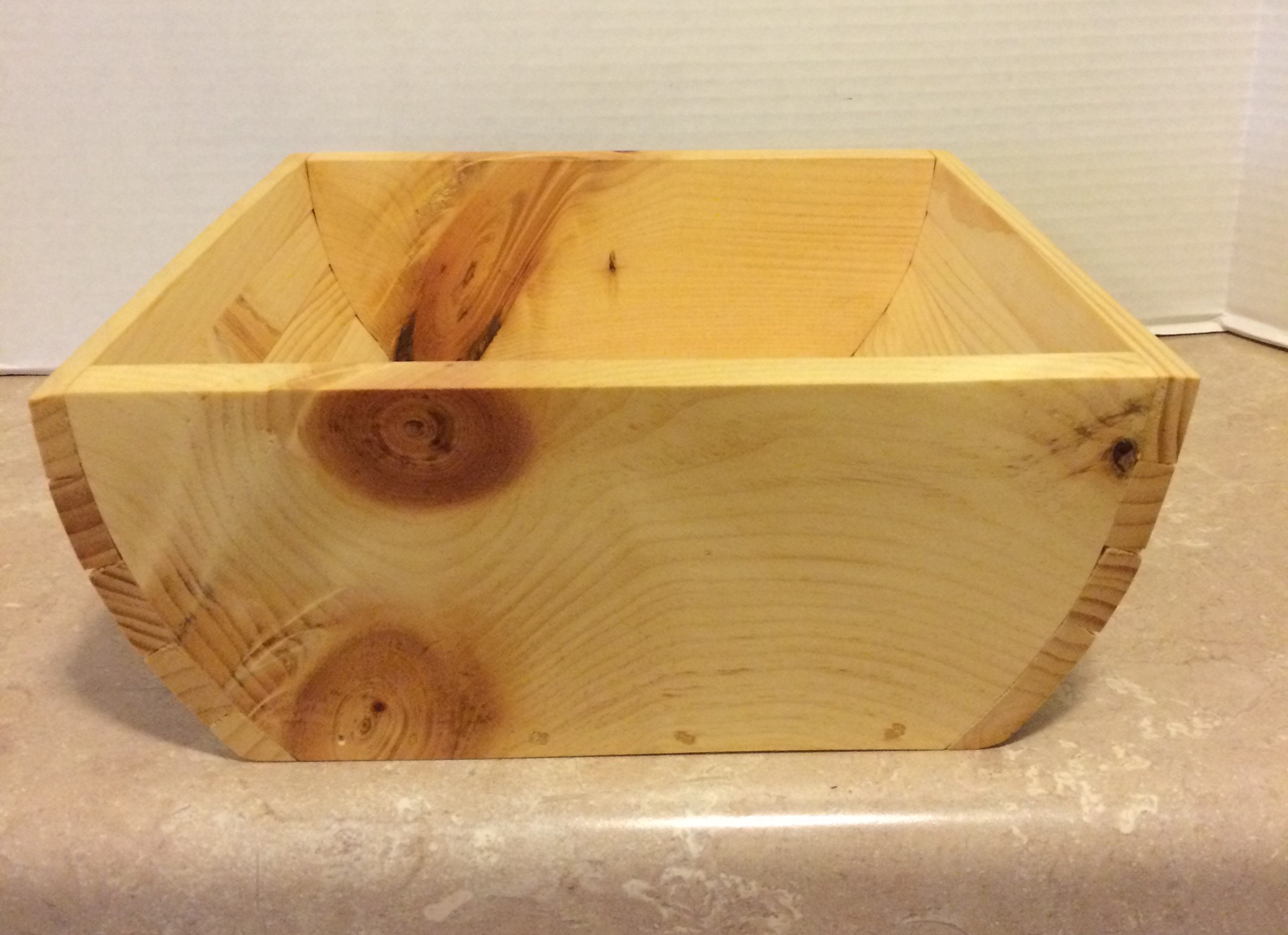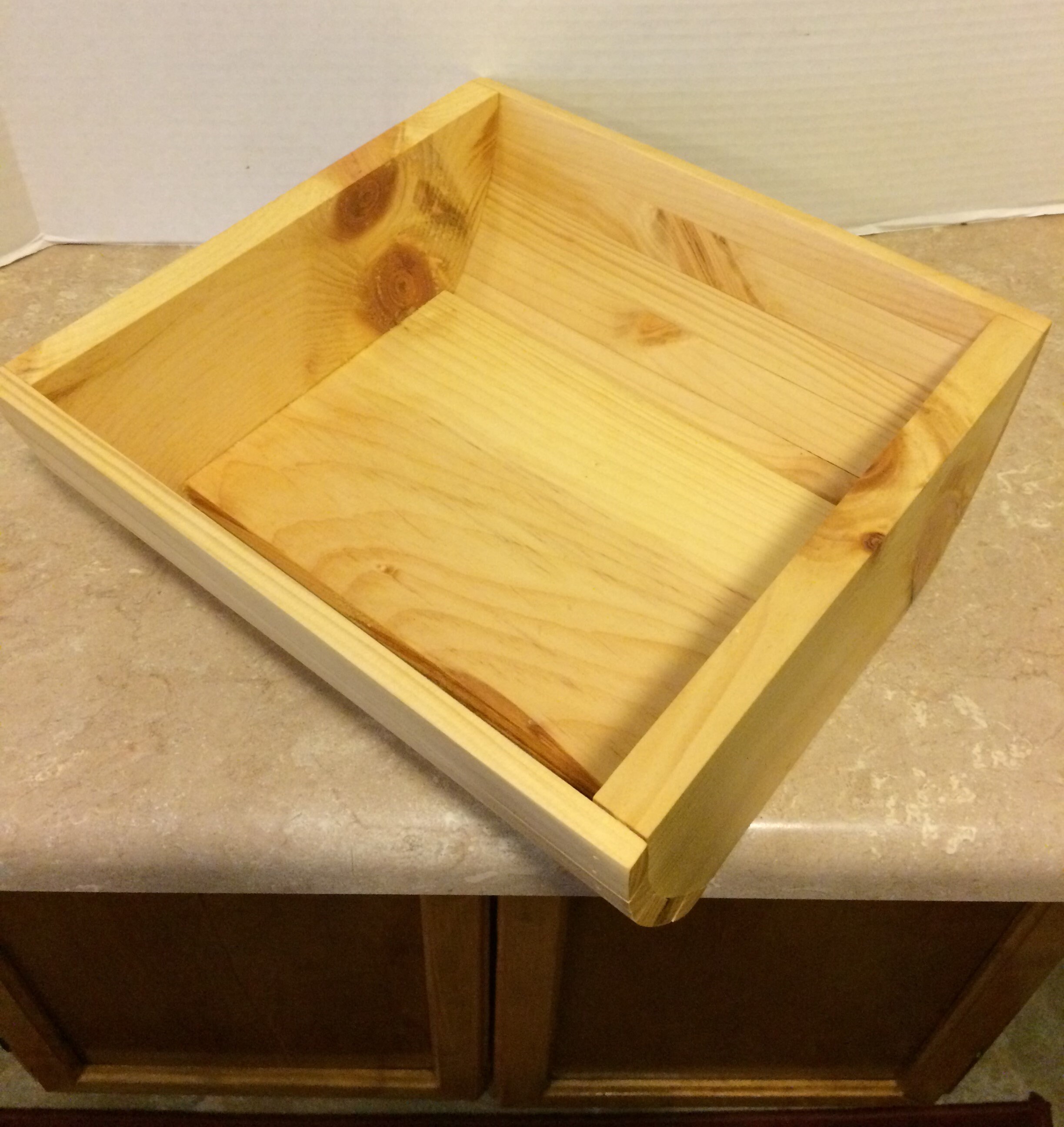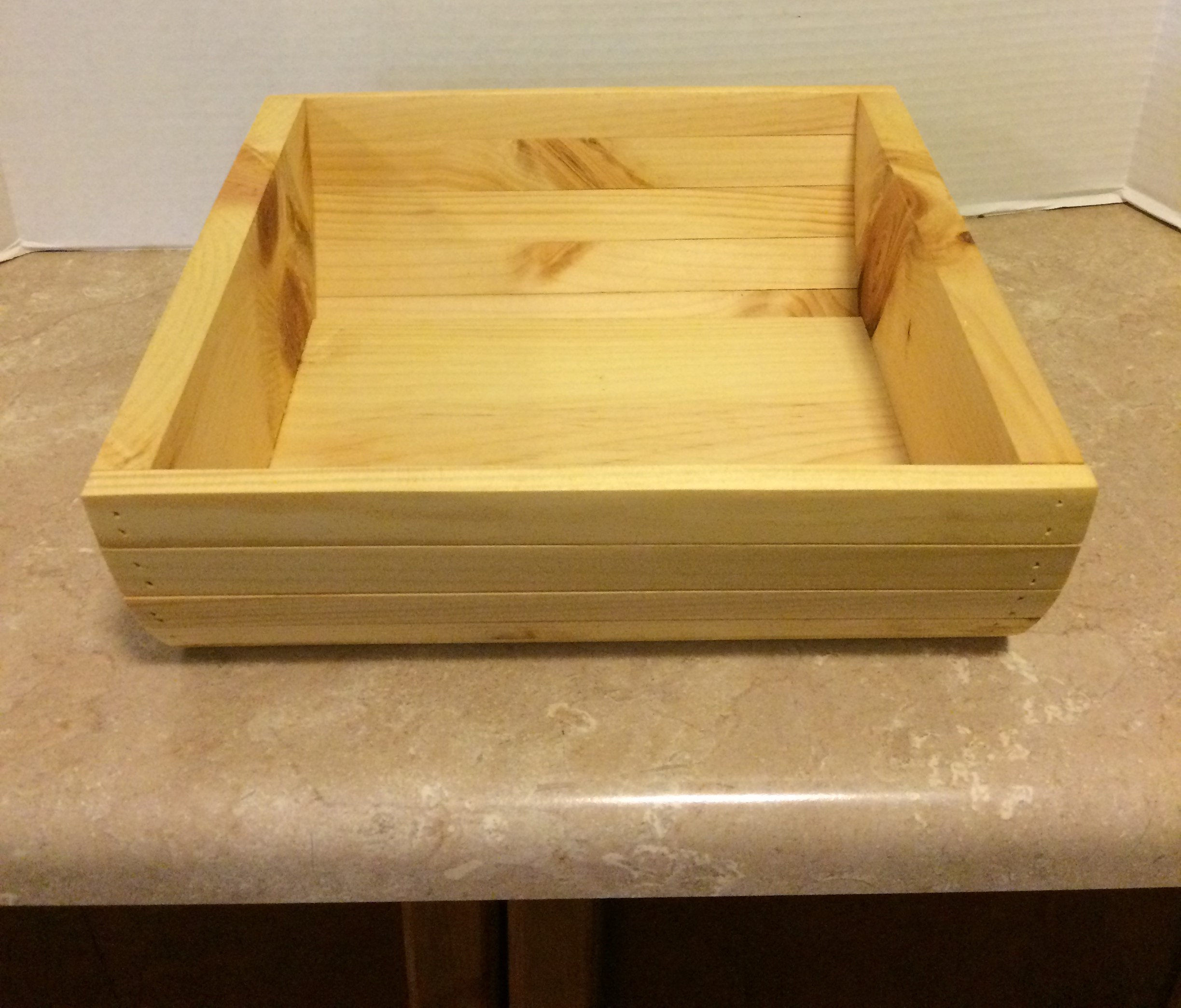 Fruit Basket, This wooden fruit basket is handmade using knotty pine wood. It is securely held together using brad nails, and wood glue. It has two coats of polyurethane. The measurements are 11 1/2 wide x 12" long x 4 1/2" high. It can be used as a fruit basket, or it can be used for dish towels. It can also be used in the bathroom for makeup storage or just about anything you want to store in it.