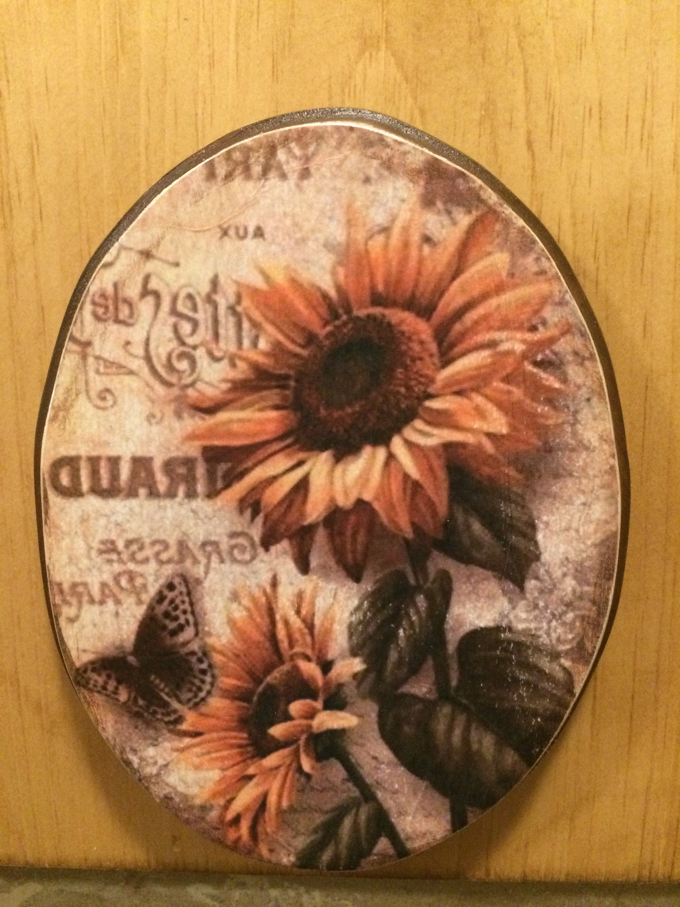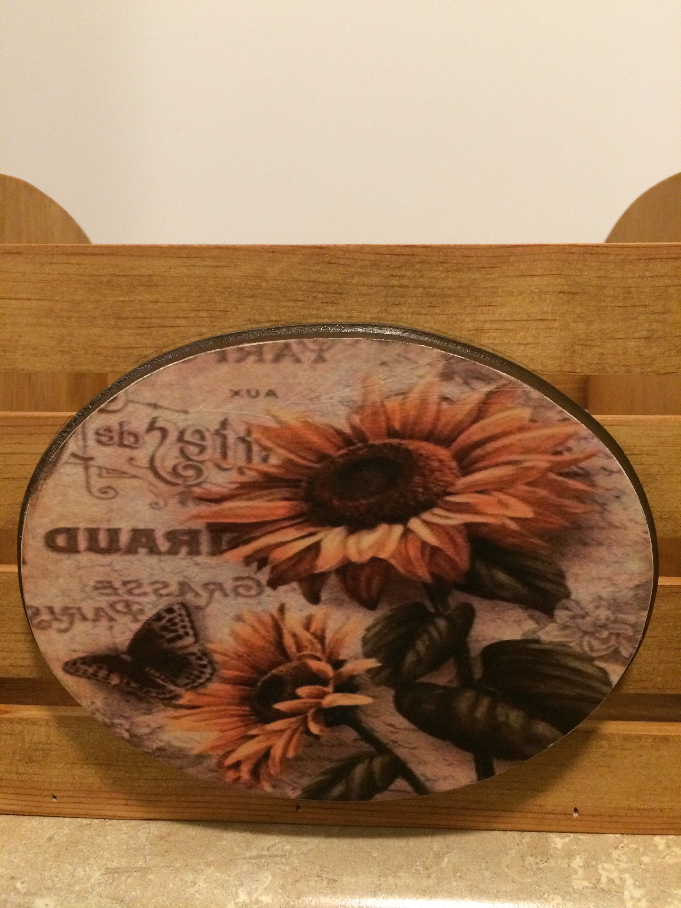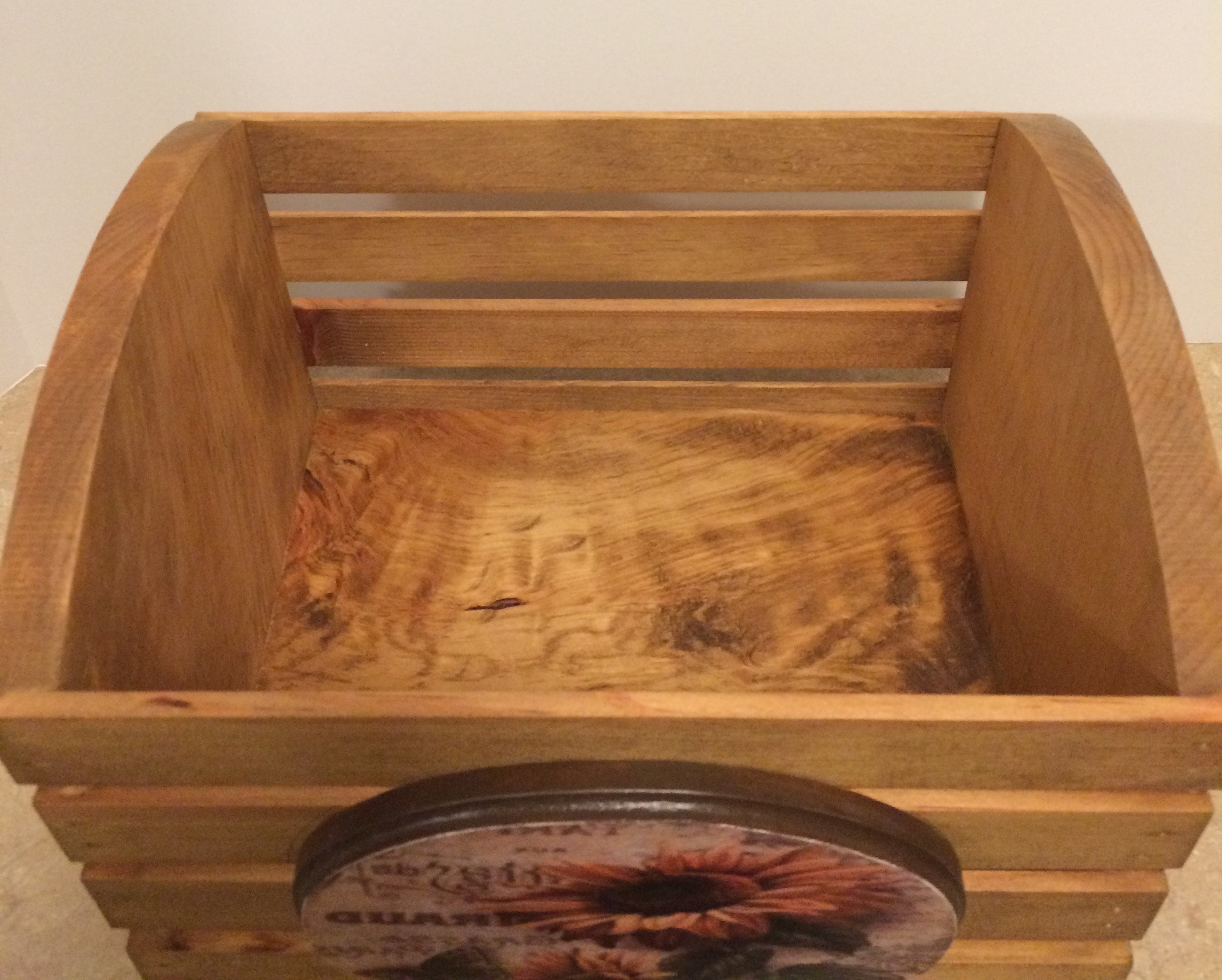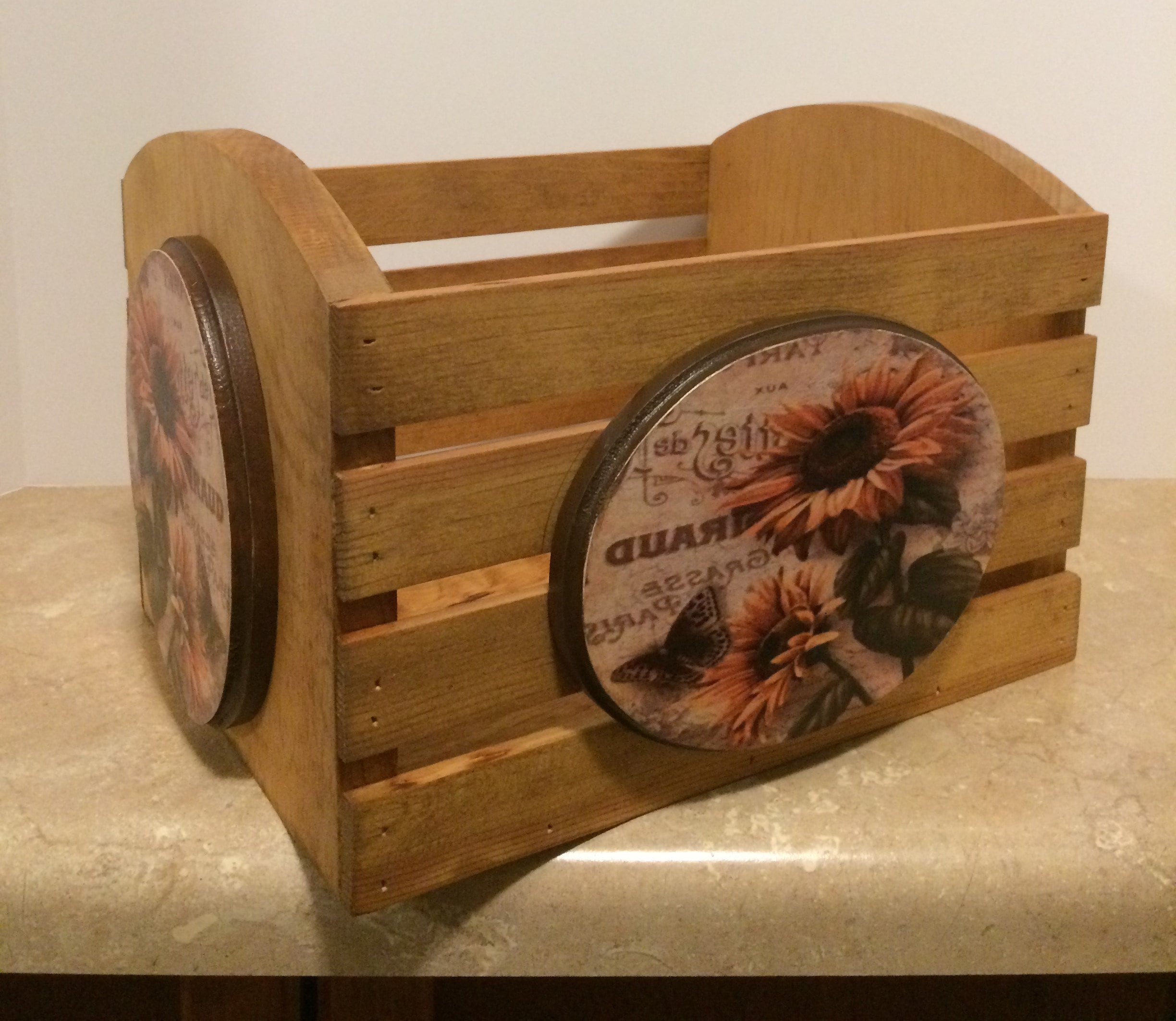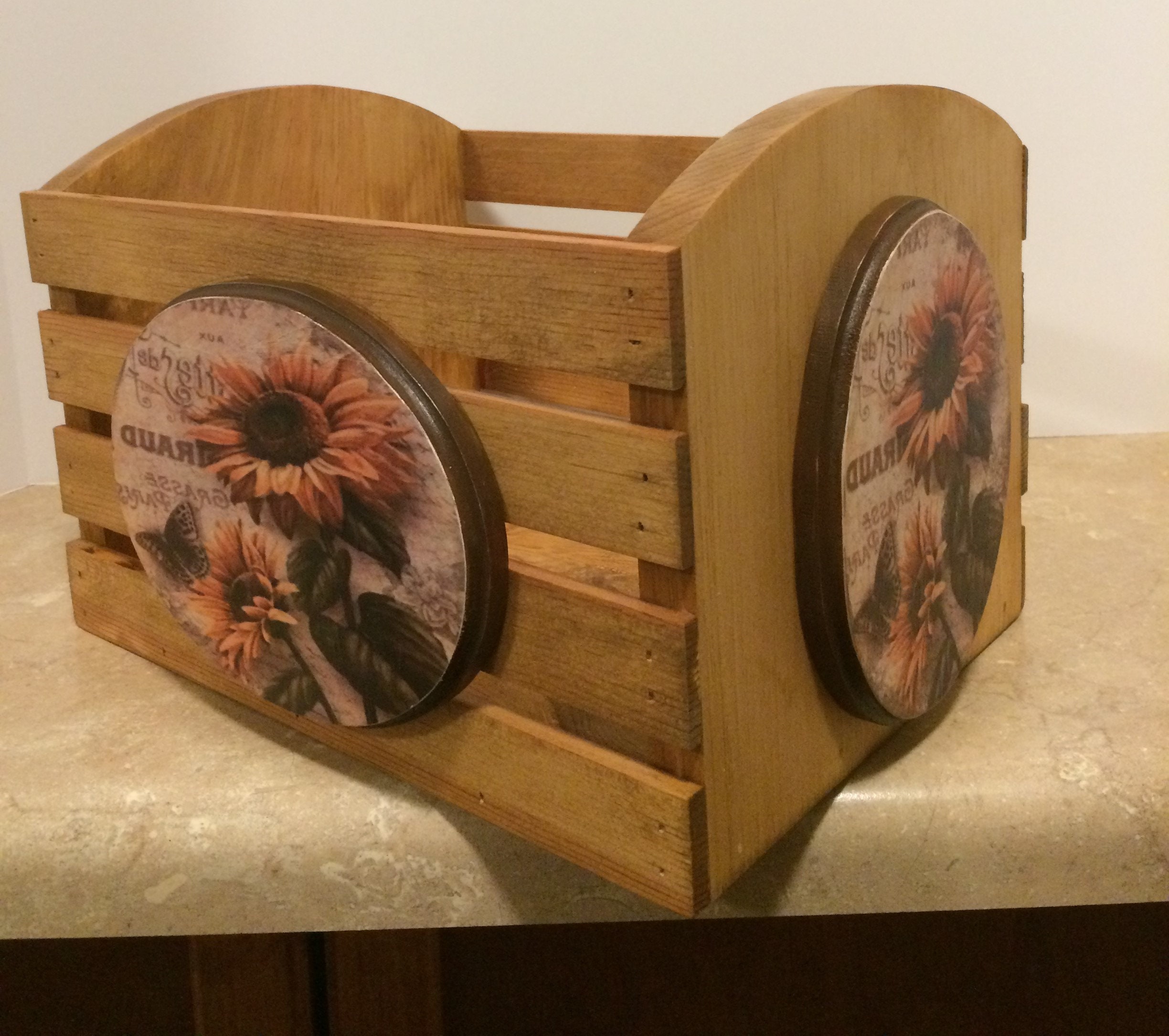 Wooden Box, this decorative wooden box is handmade using pine wood. Brad nails and wood glue securely hold it together. It is stainded golden oak. The wooden plaques are cut from pine wood using a band saw. They are attached by using wood glue. There is one on the front of the box, and one on each side. The sunflowers pictures are applied using the decoupage technique with tissue paper, then two to three coats of varnish is applied. This beautiful Sunflower box measures 11.5" wide, 8" tall, and 7" deep. This beautiful box can be used for storing just about anything in any room in your home. It can be used in the kitchen for storing dish towels/cloths, or used as a fruit basket. In the living room for magazines and books, in the bathroom for towels, and wash cloths or just about anything. There are so many uses for this wooden box, while also making a beautiful addition to any room. It would also make a lovely gift.