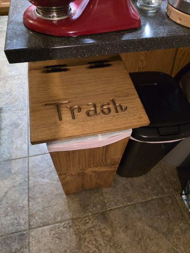 Wooden Trash Bin, This Farmhouse Rustic trash bin is handmade using knotty pine wood. The hinges are the black hammered hinges. It is stained Golden Oak. The word Trash is hand routered on the lid. The lid removes to put trash bag into the bin, and the top lid raises to put trash into the bin. This wooden trash bin is securely held together by using wood glue, brad nails, and screw plugs. It measures 28" high, 14" wide, and 15" deep. It holds the 13 gallon and up kitchen trash bags. Our trash bins do not have liners in them, and they are not stained on the inside. This rustic wooden trash bin would look great in any kitchen, and would make a wonderful gift.