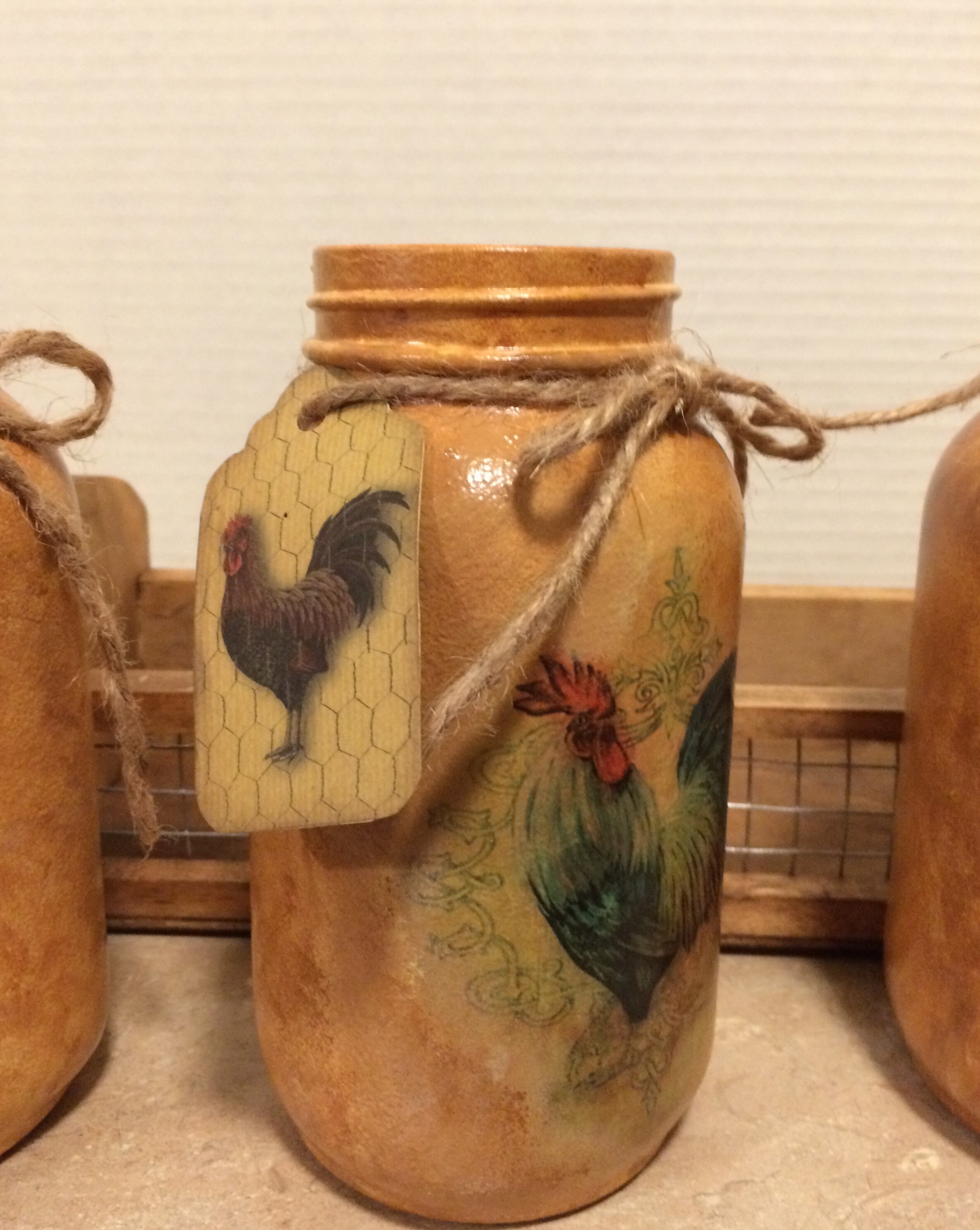 These Mason Jar Kitchen Utensil Holders are hand painted with two coats of chalk paint, and then varnished with 2 to 3 coats of waterbased varnish. The rooster is applied using the decoupage technique. There is a coordinated tag on the middle jar for gift giving which is printed on card stock paper. There is a jute bow tied on each jar. The planter box is handmade using pine wood, and then stained Early American. There is poultry netting in the front of the wooden planter box. Included are 3 quart jars, and the planter box. The utensils are NOT included. The wooden box is 13, 3/8" long, and 4 1/2" high. This Mason Jar utensil Holder would be a lovely addition to your Farmhouse or Country Kitchen Decor, or it would make a lovely housewarming gift, or an anytime gift for that special person. DO NOT immerse the jars in water. Wipe clean with a dry or slightly damp soft cloth.
