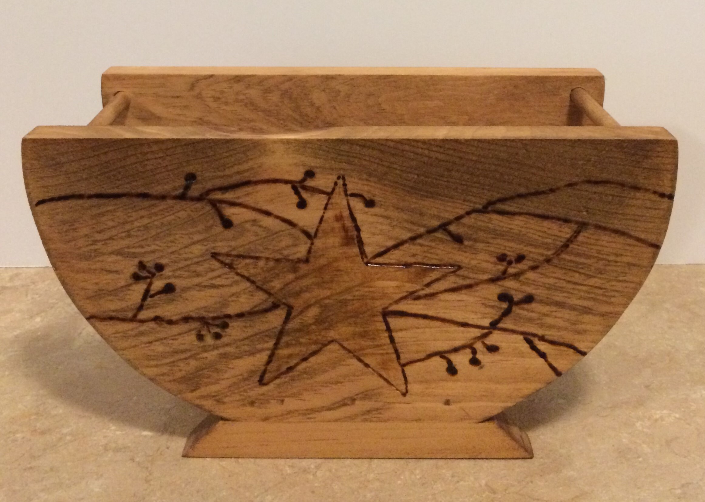 Wooden Paper Plate Holder. This rustic primitive paper plate holder is made from pine wood, and dowel rods. Wood glue, and brad nails securely hold it together. It is stained Early American. The primitive star and pip berry vines are burnt into the wood using a wood burning tool. It will hold the large paper plates. The dimensions are 12" long, 6 5/8" high, and 4" deep. This farmhouse rustic paper plate holder would look great inany kitchen, or make a wonderful gift.