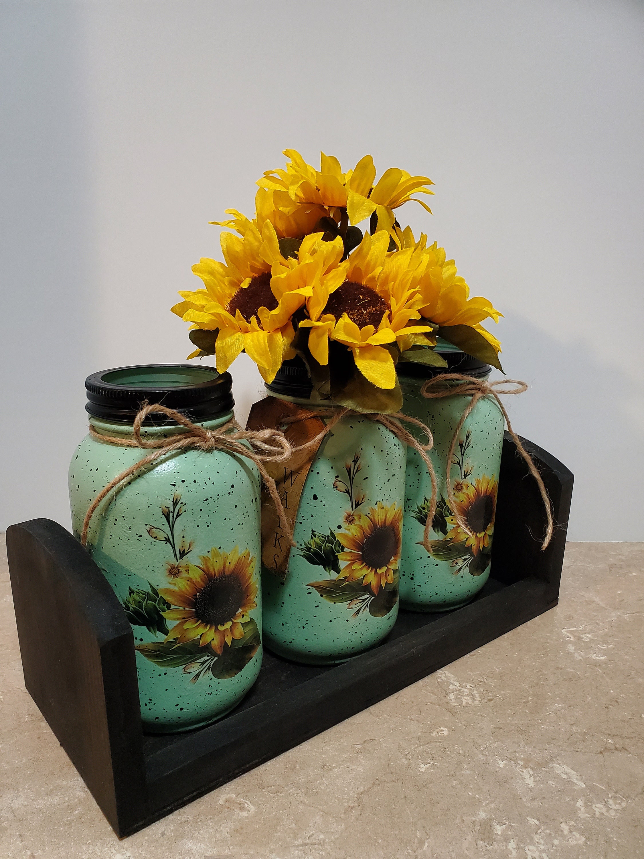 Mason Jar Utensil Holder. These mason jar quart size kitchen utensil holders come with everything pictured except the utensils. The sunflowers are included along with the wooden box, and the three jars. The jars are hand painted with sage blossom chalk paint. The sunflowers ARE NOT stickers. They are printed out on tissue paper and then applied using the decoupage technique, and then 2 to 3 coats of varnish is applied. There is a jute bow tied around each jar, and a matching tag for gifting. The wooden box is handmade from pine wood, and is stained Ebony. The sunflowers in the middle jar can be removed. These sunflower mason jar utensil holders would look great in any country or farmhouse kitchen, or would make a great gift. DO NOT immerse jars in water or put in dishwasher. Wipe clean with a slightly damp cloth